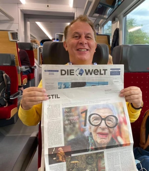 Im Zug nach Mailand freut sich der Midas-Verlegr (s. Foto) deshalb über die grosse Presseresonanz aus Anlass ihres 100. Geburtstags: In Deutschland haben u.a. die »WELT«, die »BILD am Sonntag« sowie diverse Tageszeitungen grosse Artikel zur legendären Iris Apfel publiziert, in Österreich die »Kronen Zeitung«, die »Presse« und diverse andere.
