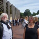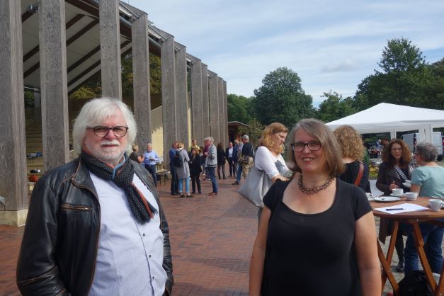 Schließlich stellten die neue Vorsitzende Martina Tittel, geschäftsführende Gesellschafterin der Nicolaischen Buchhandlung, und die zweite Vorsitzende, AvivA-Verlegerin Britta Jürgs, den im Juni gewählten Vorstand vor, und außerdem konnten die im Frühjahr mit dem Gütesiegel Leseförderung ausgezeichneten Buchhandlungen ihre Urkunden entgegennehmen. Ein weiteres Highlight war der Auftritt von Ruth Klinkenberg und Detlef Bluhm. Aus Anlass des 75-jährigen Jubiläums des Landesverbands am 21. November haben die beiden in Archiven gewühlt. Dass sie die Fotos aus technischen Gründen nicht zeigen konnten, war schade, ihr kleiner Vortrag über Aspekte aus der Verlagsgeschichte war dennoch ein Genuss und bot Gesprächsstoff fürs anschließende Get-together am Grill – bis später der angekündigte Regen dann doch noch einsetze. Wie gut, dass die Freilichtbühne überdacht ist.