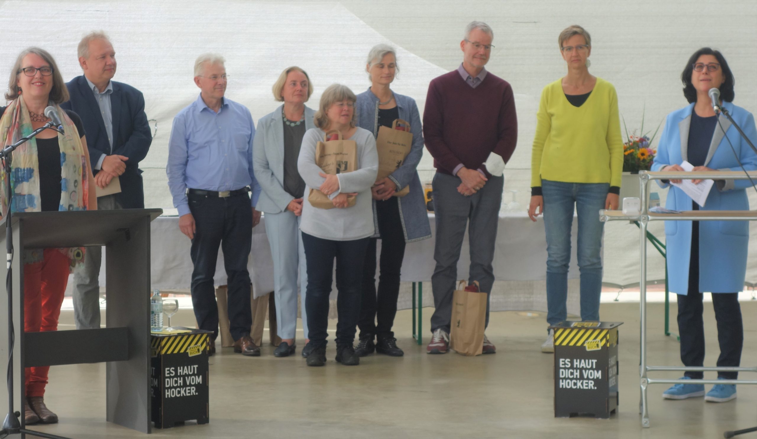 Geschäftsführerin Johanna Hahn begrüßte die Gäste an der Freilichtbühne am Gutshof Britz in Neukölln, darunter Berlins Kultursenator Klaus Lederer, der trotz des Wahlkampfs Zeit für einen Besuch beim Branchentreffen gefunden hatte. Viel Applaus bekam er für die Senatsentscheidung, die Berliner Buchhandlungen während der Pandemie offen zu halten. Auch gestern gab sich Lederer als Buchliebhaber und Förderer der Branche zu erkennen. Der Mensch lebe nicht nur von Brot und Benzin sagte er. Wer sich während des Lockdowns schon nicht mit anderen Menschen treffen konnte, sollte wenigstens die Möglichkeit haben, an ein Buch zu kommen, ohne auf Amazon oder die kleine Auswahl im Supermarktregal angewiesen zu sein. „Stationäre Buchhandlungen in der Nachbarschaft sind unverzichtbar“, betonte Lederer, denn nur so könne man neue Zielgruppen erreichen und von Anfang an Lust aufs Lesen wecken.