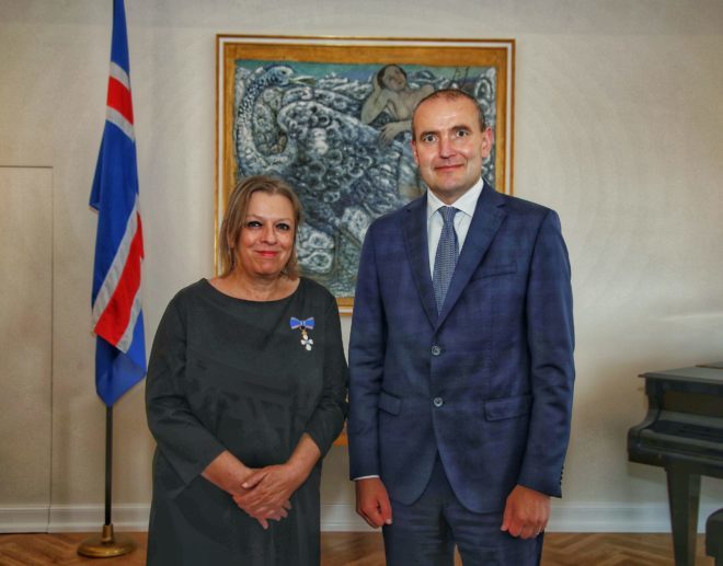 Regina Kammerer und der isländische Präsident Guðni Thorlacius Jóhannesson bei der Zeremonie auf Bessastaðir © Árni Sæberg.