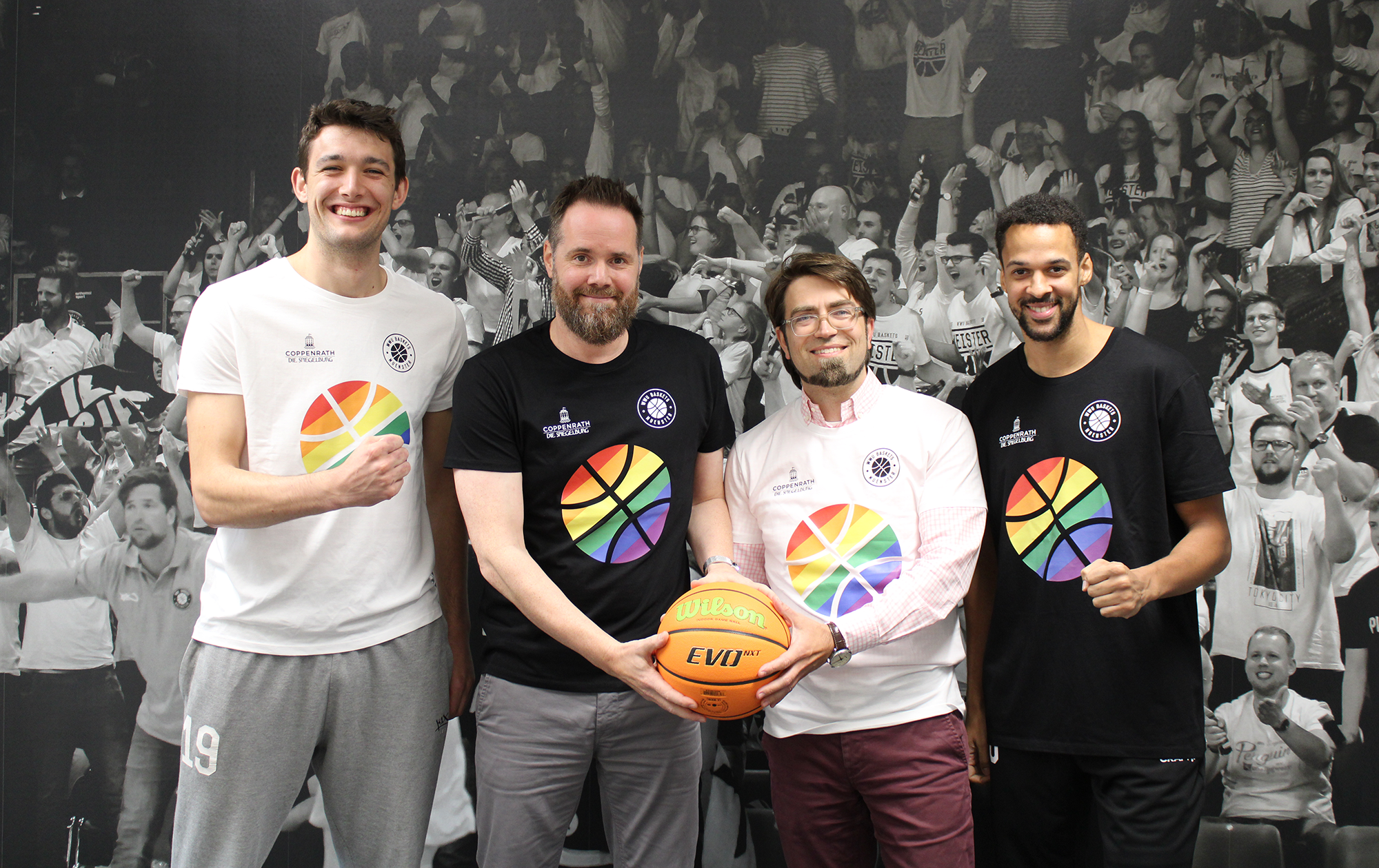 „Können kleine Menschen Basketball spielen?“, „Darf ich mit dem Rollstuhl auf das Spielfeld?“, „Ich bin neu hier, darf ich mitmachen?“ – viele Fragen und eine Antwort: Klar, denn bei den Spielen der WWU Baskets ist jeder willkommen. Das drückt jetzt auch eine Kooperation aus, die der Verein gemeinsam mit dem Coppenrath Verlag eingegangen ist. Im ersten Schritt haben die Partner gemeinsam ein T-Shirt im Regenbogen-Design entwickelt.