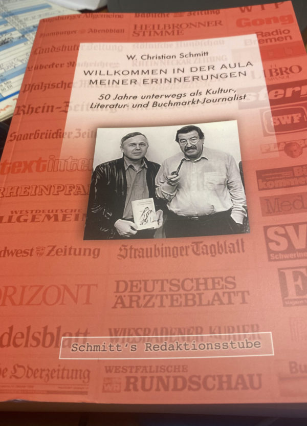 Diesen Traum hat Schmitt sich jetzt erfüllt, das Buch ist fertig – und so schnell, dass es eine Abbildung davon noch nicht mal auf seine Webseite geschafft hat. Unter dem Titel „Willkommen in der Aula meiner Erinnerungen. 50 Jahre unterwegs als Kultur-, Literatur- und Buchmarkt-Journalist“ ist seine Autobiografie jetzt im Verlag Schmitt’s Redaktionsstube. erschienen: Diese Fundgrube für alle, die noch einmal Highlights der letzten 50 Jahre Revue passieren lassen möchten und erfahren wollen, wie spannend es sein kann, einen völlig anderen Blickwinkel auf das zu spüren, was man selber ganz anders gewertet hat, gibt es jetzt als Wälzer von 496 Seiten, mit mehr als 350 Fotos und Abbildungen, (zum Preis von 25,- Euro) über seine Maildresse wcschmitt@aol.com