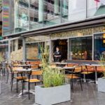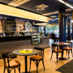 Im Erdgeschoß verweisen wir mit dem typischen Mayersche Corporate-Design auf unsere jüngere Vergangenheit und auf unseren Firmengründer, das „J A Mayers Bistro“ im Art Deco Stil mit Außenbestuhlung.
