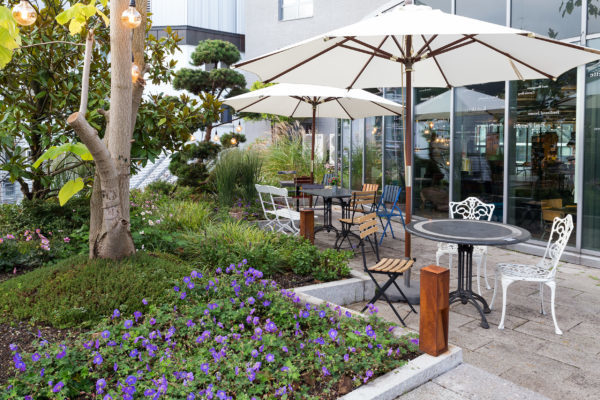 Der Literaturgarten ist nun lebendig, mit neuer Bepflanzung, Lichterketten, Biertischen, Liegestühlen, einer kleinen Arena und einem bunten Kräutergarten für unsere Küche. Im Literaturgarten, umgeben von Pflanzen und einer wunderbaren Ruhe, fernab vom Lärm der Straße, kann man innehalten und sich auf sich selbst konzentrieren.: