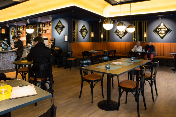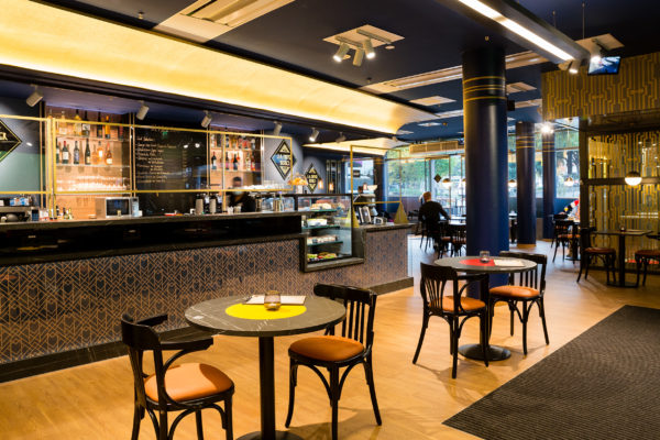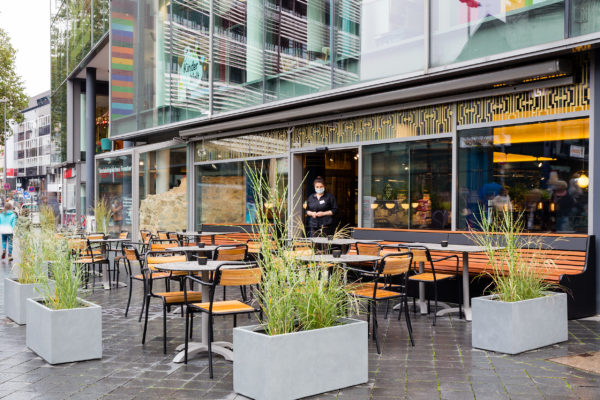 Im Erdgeschoß verweisen wir mit dem typischen Mayersche Corporate-Design auf unsere jüngere Vergangenheit und auf unseren Firmengründer, das „J A Mayers Bistro“ im Art Deco Stil mit Außenbestuhlung.