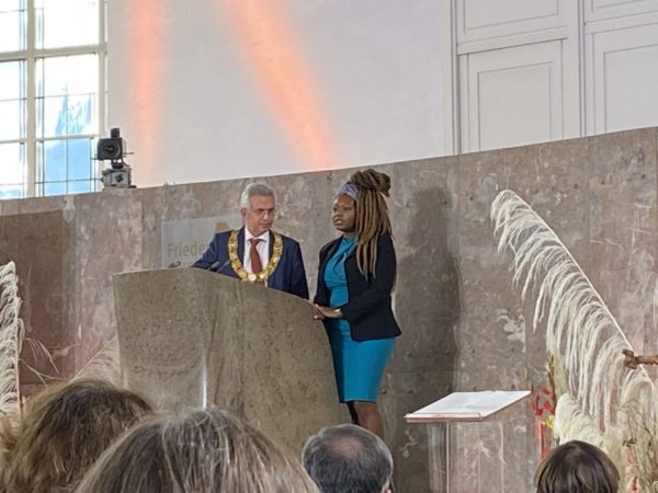 Mit der Hoffnung, dass ein solcher Paradigmenwechsel möglich ist, schloss die Preisträgerin ihre Rede: „Unsere Entscheidung, was und wie wir denken, ist letztlich eine Entscheidung zwischen Gewalt oder Frieden fördernden Inhalten und Narrativen. Dass jemand wie ich, der in nicht so ferner Vergangenheit aufgrund von demografischen Kriterien im schlimmsten Fall als nicht denkend, im besten Fall als nicht auf eine wertvolle Weise denkend und deshalb auf nicht wertvolle Weise existierend kategorisiert wurde, heute diesen Preis erhält, bezeugt die Fähig-keit für Wandel, die wir Menschen haben.“