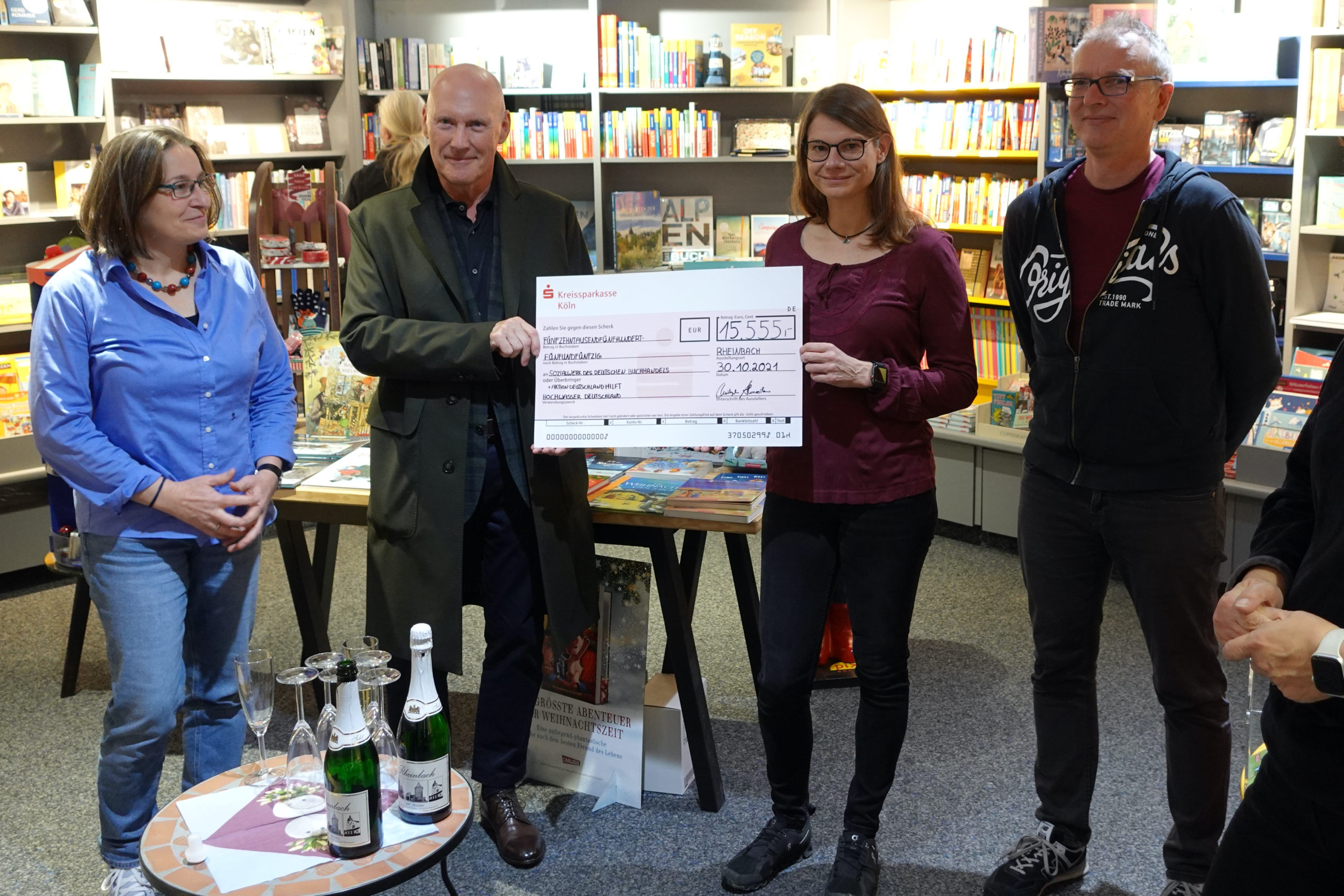 Nachdem das Projekt Anfang August angerollt war, gewann es zunehmend an Fahrt. Nach mehreren Presseartikeln und sogar einem Radiointerview meldeten sich immer mehr Verlage, Autoren und sogar Privatpersonen, die ihre Beteiligung anboten. Waren die zwischenzeitlich 200 Bücher schon überwältigend, konnten zum Schluss mehr als 580 Produkte zum Versteigern angeboten werden. Darunter viele Bücher bekannter Autoren, wie z.B. Sebastian Fitzek, Juli Zeh, Anselm Grün, Ewald Arenz, Dr. Eckart von Hirschhausen, sowie eine privat gespendete Radierung von Günter Grass. Am Ende der Auktionen, die aufgrund der großen Rückmeldungen auf 4 Termine gelegt wurde, begann die weitere Arbeit: Bestellungen bearbeiten, Bücher einpacken, zur Post bringen bzw. zur Abholung bereitstellen, Benachrichtigungen an die Gewinner herausschicken, Listen und Webseite aktualisieren usw. Gemeinsam mit Christel Engeland, die Renate Harder bei der Organisation unterstützte und Aushilfen, die beim Einpacken halfen, konnte die Arbeit bewältigt werden. Täglich wurden die Listen aktualisiert, um den aktuellen Stand der Gewinne zu errechnen. Als 4.000 € erreicht wurden, war die Euphorie groß, aber schnell war klar, dass es weiter nach oben gehen würde. Bald wurden nächste Tausender angepeilt und schließlich standen gut 15.000 € auf dem Konto. Dank Christoph Ahrweiler, dem Besitzer der Buchhandlung Kayser, der die Summe aufstockte, konnten am vergangen Samstag als Rheinbacher Abschlussveranstaltung der „Woche der unabhängigen Buchhandlungen“ 15.555 € übergeben werden. Anwesend war Karl Halfpap vom Vorstand des Sozialwerks des Börsenvereins des deutschen Buchhandels, der 50% der Spendensumme in Empfang nahm. Sie kommt dem Fluthilfefond des Sozialwerks der Buchbranche zu Gute, das seit 180 Jahren unverschuldet in Not geratenen Buchhändler*innen aller Sparten hilft. Die andere Hälfte des Gewinns geht an die „Aktion Deutschland hilft“. „Auf diese Weise können wir betroffenen Kollegen helfen, aber auch Menschen in unserer Region.“, so Buchhändlerin Christel Engeland.