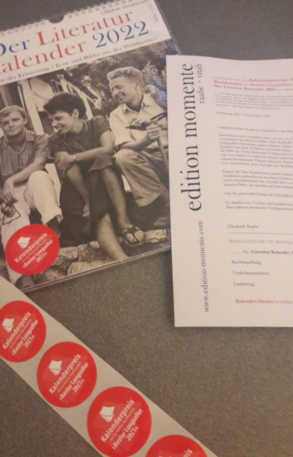 Elisabeth Raabe: „Die ersten Mails sind schon gekommen, und wir hoffen, dass der rote Sticker genügend Signalwirkung für alle Kundinnen und Kunden besitzt, die unseren Kalender suchen. Denn immer noch nicht wissen es alle unsre Kunden: Es ist wirklich ein Longeseller. Wir bringen diesen unseren Literatur Kalender zusammen mit dem Gestalter Max Bartholl seit bald 40 Jahren heraus: 1985-2005 im Arche Verlag, ab 2006 im Arche Kalender Verlag und seit 2019 in edition momente, nun unter dem Titel Der Literatur Kalender, und nach wie vor mit autobiografischen Texten und Fotos zu einem wechselnden Jahresthema (2022: Momente der Erinnerung) aus dem Leben von Autorinnen und Autoren der Weltliteratur – echte Fundstücke für jede, jeden Literaturfan!“