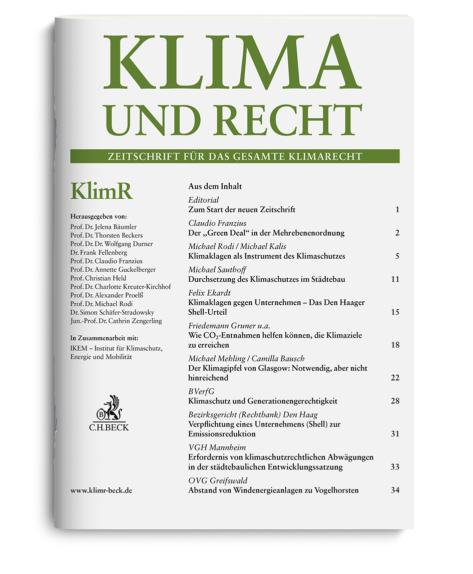 Heute erscheint die erste Ausgabe der neuen juristischen Fachzeitschrift Klima und Recht (KlimR), die der Verlag C.H.BECK in Zusammenarbeit mit dem Institut für Klimaschutz, Energie und Mobilität (IKEM) herausgibt. Die monatlich erscheinende Zeitschrift begleitet die Entwicklung des Klimarechts mit Beiträgen erstrangiger Autorinnen und Autoren sowie mit praxisgerechten Informationen zu allen rechtlichen Facetten des Klimaschutzes. Unterstützt von einem zwölfköpfigen Herausgebergremium übernehmen IKEM-Direktor Prof. Dr. Michael Rodi und Geschäftsführer Dr. Simon Schäfer-Stradowsky die Schriftleitung der Klima und Recht.