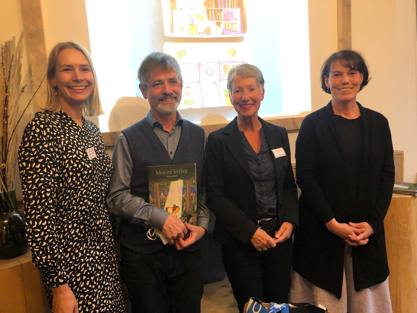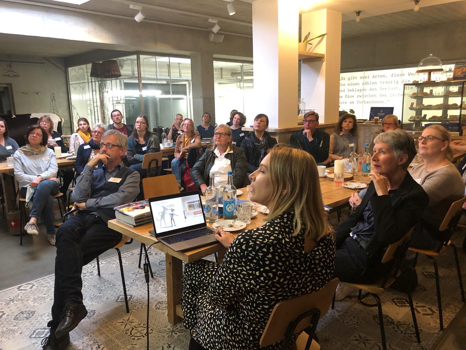 Diesmal war es die Bilderbuch-Künstlerin Antje Damm, die einen Überblick über ihren Werdegang und ihre Werke bot, unterhaltsam über die prägende Zusammenarbeit mit Kindern berichtete und für alle Anwesenden gar ein kleines Geschenk mitgebracht hatte. Auch sie genoss es, endlich wieder Gespräche in großer Runde führen zu können. Das abschließende Abendessen im Hafenrestaurant „Pasta e Basta“ in etwas kleinerer Besetzung zeigte aufs Neue, wie wichtig der lange so schmerzlich vermisste direkte Austausch zwischen Verlagen und Buchhandlungen ist. So wurde gleich der Boden für weitere gemeinsame Aktionen bereitet.