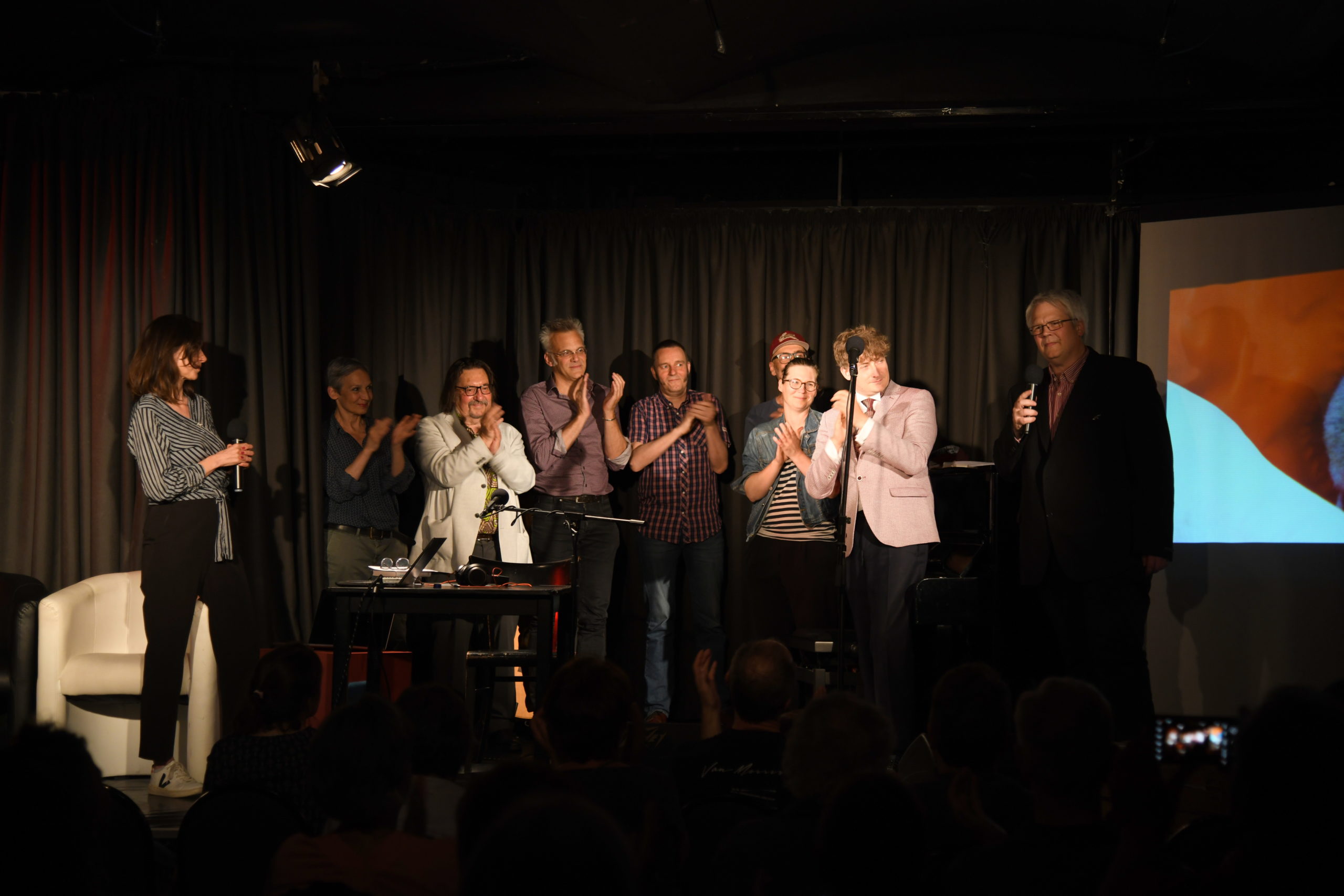 Dann baten die beiden Autorinnen im Wechsel befreundete Künstler*innen auf die Bühne. Marion Brasch, Ahne und Kirsten Fuchs lasen über die bayerische Kurzohrmaus, mit ihren sieben Problemen, unter die auch ihre ungesicherte Existenz fällt, sollte man sich im Ohr zergehen lassen, den europäischen Stör (hypersensibel!) und den Schnilch (besänftigend und Kreativitätssteigernd).