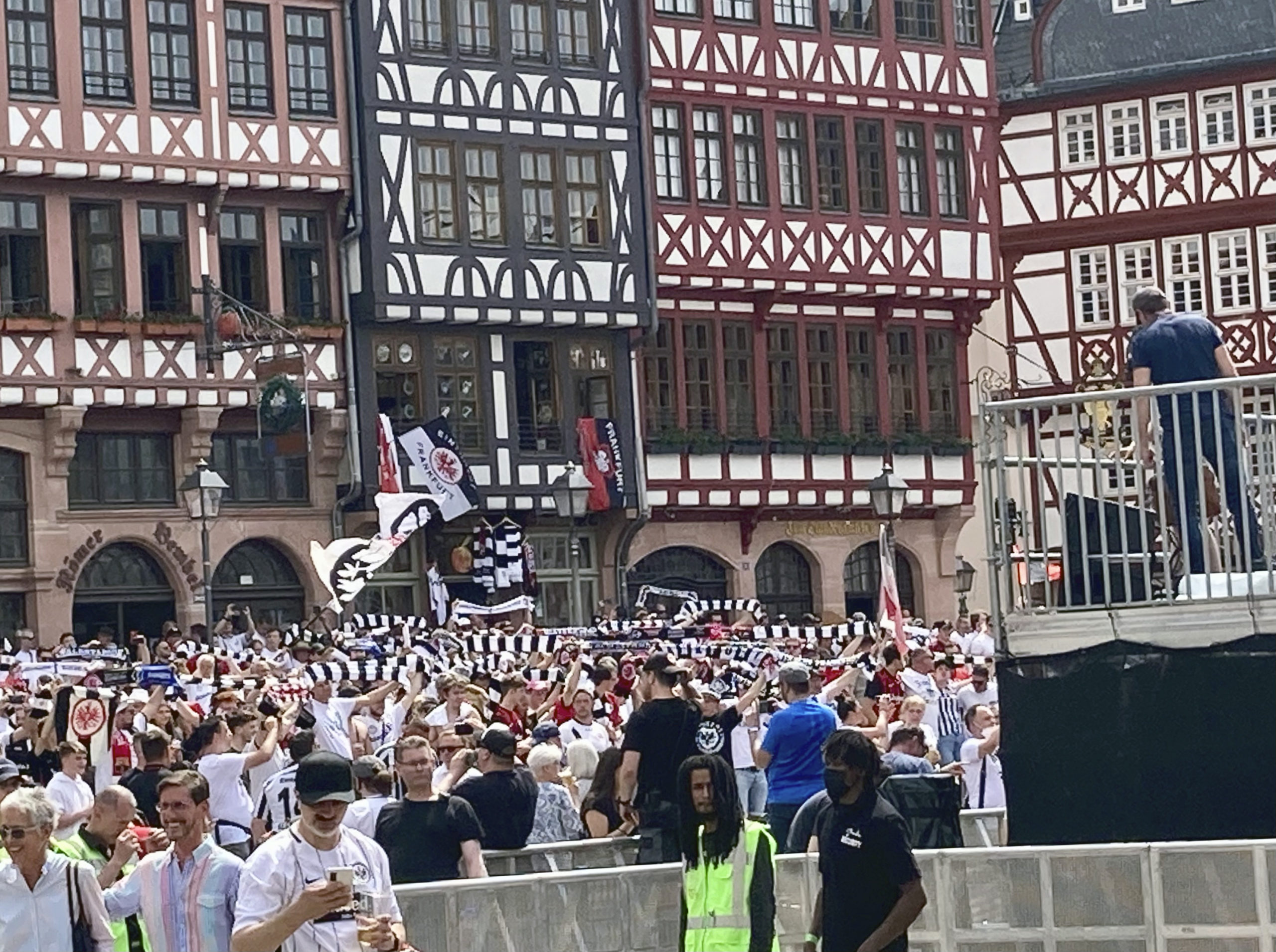 Den rund 70 Teilnehmer*innen der diesjährigen Tagung der Interessengemeinschaft Hörbuch wurde am 19. und 20. Mai im Haus des Buches in Frankfurt am Main einiges geboten: Nach den digitalen Treffen der Vergangenheit freute man sich bei hochsommerlichen Temperaturen – inklusive Gewitter– darüber, sich endlich wieder in Präsenz begegnen zu können. Da am Abend zuvor die Eintracht Frankfurt den Europapokal gewonnen hatte, fühlte man sich am Donnerstag schon auf dem Weg zum zentral gelegenen Veranstaltungsort in keinem Moment allein. Einen Steinwurf entfernt sammelten sich am Römer im Laufe des Tages beseelte Fans, bis es am Abend auch die Mannschaft per Autokorso auf die Bühne geschafft hatte.