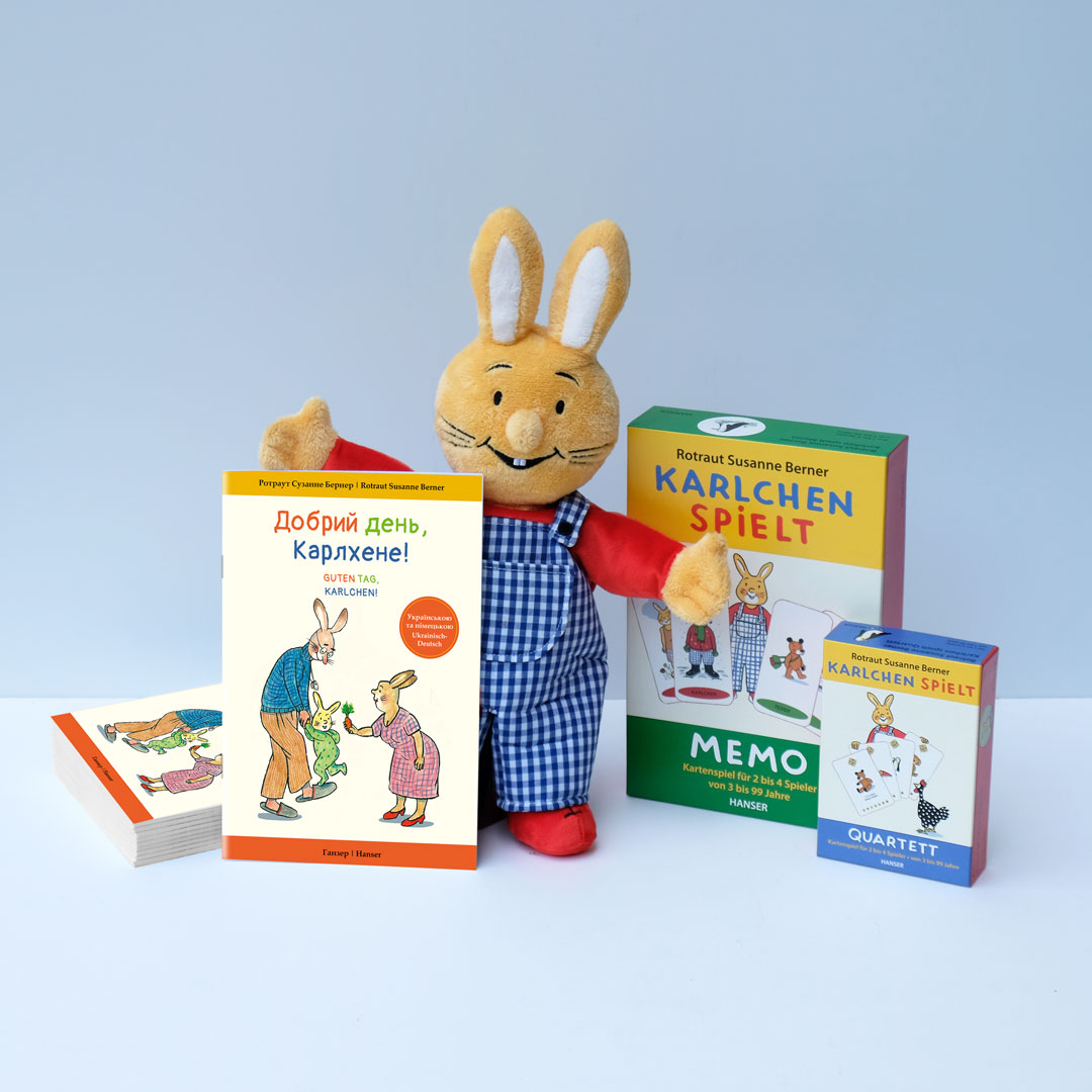 Der Hanser Verlag verschenkt 5.000 Exemplare des ukrainisch-deutschen Guten Tag, Karlchen! von Rotraut Susanne Berner sowie Karlchen-Spielzeug. Die Übersetzerin Oleksandra Hryhorenko übersetzte bereits das Buch Karlchen für jeden Tag ins Ukrainische. Das Hanser-Aktionspaket enthält zehn Exemplare Guten Tag, Karlchen!, vier Karlchen-Memos, drei Kartenspiele und eine Handpuppe. Es ist ab 22. Juni lieferbar unter der Bestellnummer 545/89358. Die Verteilung erfolgt über den deutschen Buchhandel, der direkt beim Verlag bestellen kann, solange der Vorrat reicht: bellvertrieb@hanser.de. Pädagog:innen, Vereine, Hilfsorganisationen und andere für Geflüchtete Engagierte werden gebeten, sich mit einer Buchhandlung vor Ort in Verbindung zu setzen.