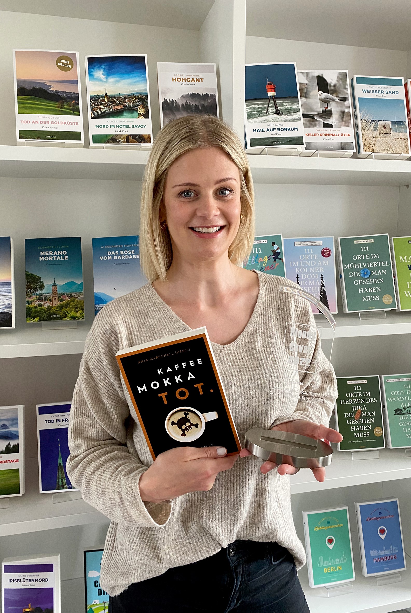 Der Emons Verlag freut sich sehr über den Gewinn des Bloody Cover-Award 2022. Mit Die Farbe des Vergessens und Kaffee. Mokka. Tot waren in diesem Jahr gleich zwei Cover von Art Direktorin Nina Schäfer für den Preis nominiert, der jährlich für das „originellste, stimmigste, markanteste oder kurzum das schönste Krimi-Cover“ vergeben wird. Den ersten Platz holte sie am Ende mit der von Anja Marschall herausgegebenen Krimi-Anthologie Kaffee, Mokka, Tod. Das bewusst eher schlicht gehaltene Motiv einer Kaffeetasse kombiniert mit einem Totenkopf hat die Jury überzeugt und konnte sich gegen 11 weitere nominierte Cover auf der Shortlist durchsetzen. Inzwischen hat Nina Schäfer den Award erhalten, der bereits eine Ehrenplatz im Verlag gefunden hat.