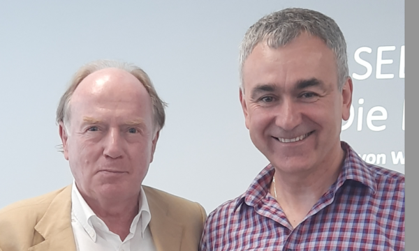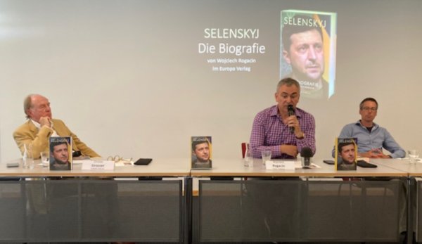 Wojciech Rogacin, Verleger Christian Strasser und Übersetzer Benjamin Voelkel haben im Berliner dbb-forum am 6.7. das Buch „Selenskyj – DIE BIOGRAFIE“ in Anwesenheit zahlreicher Pressevertreter vorgestellt.