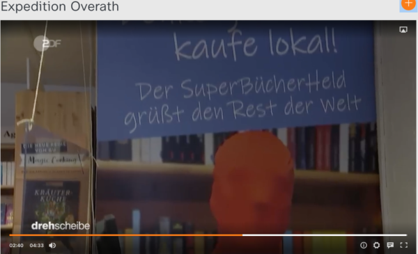 Das war – wir hatten darüber am 16.1.21 berichtet – sein Schlachtruf, mit dem er bei seinen Einsätzen am Ort ins Feld zog. Und ihm hat seine fröhliche Idee seither auch überregional immer wieder Presseberichte eingetragen. Jetzt war auch das ZDF für die Drehscheibe in Overath zu Gast …. und hat nicht nur das malerische Overath vorgestellt sonder auch Alexander Bücken und seine Buchhandlung – hier noch in der Mediathek weiter zu besichtigen.