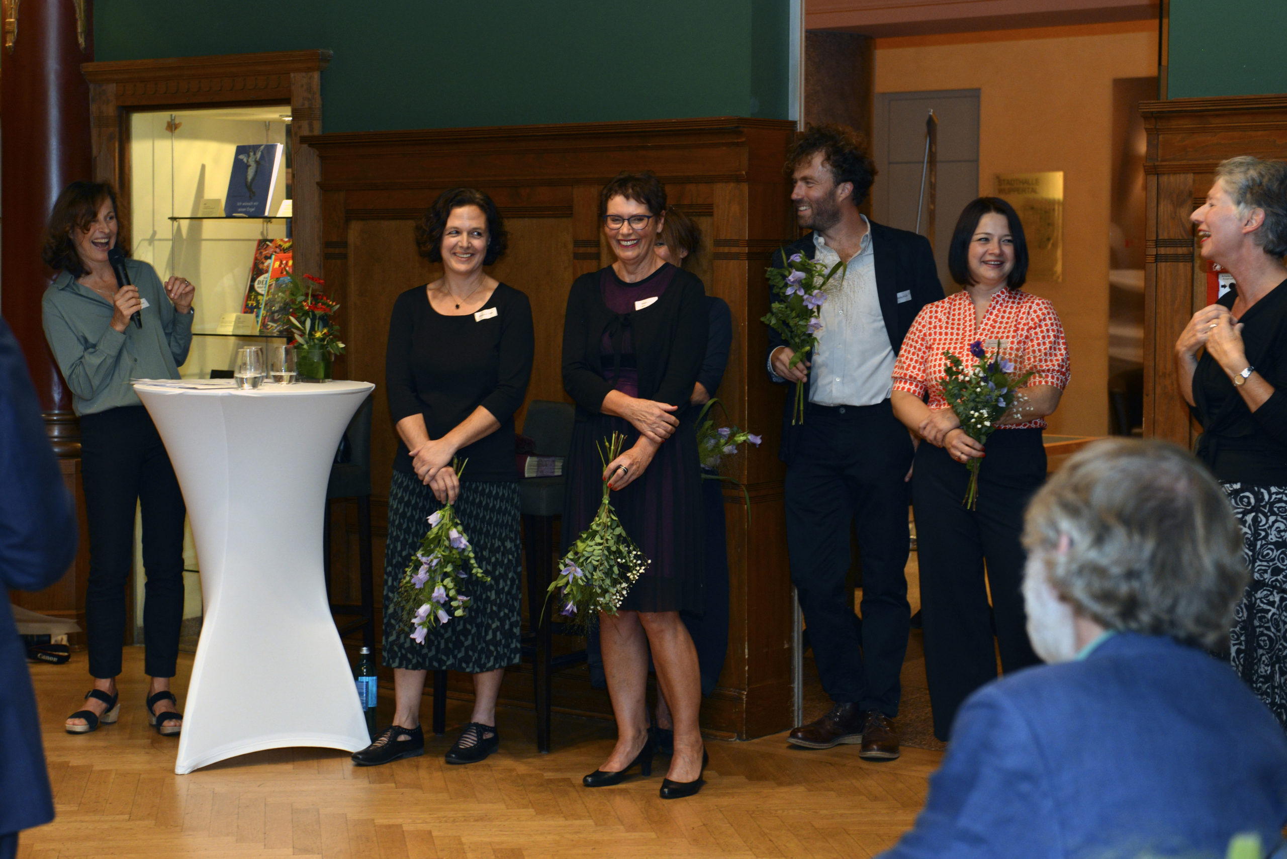 Claudia Putz, langjährige Pressesprecherin des Unternehmens, richtete im Namen des Teams berührende Worte an Monika Bilstein. Auch Susanne Blum (Vertrieb und Marketing) und Monika Pönninghaus (Sekretariat) als feste Mitarbeiterinnen sowie Magdalene Krumbeck und Grazyna Rojek als freie Herstellerinnen und Grafikerinnen sind dem Peter Hammer Verlag seit vielen Jahren verbunden. Und wer einmal wegging, sei schließlich zurückgekehrt – Moritz Klein hat in den Jahren 2010-2014 bereits als Vertriebsleiter im Peter Hammer Verlag gearbeitet. Claudia Putz dankte ihrer Chefin: