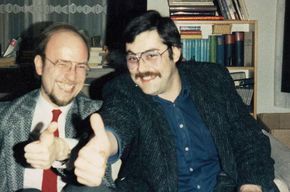 Dr. Rolf Giesen (l) und sein Gesprächspartner Martin Compact ((in diesem Jahr als „Krimi-Lektor“ vierzig Jahre unterwegs) in jungen Jahren bei der Arbeit damals für ein Ullstein Buch