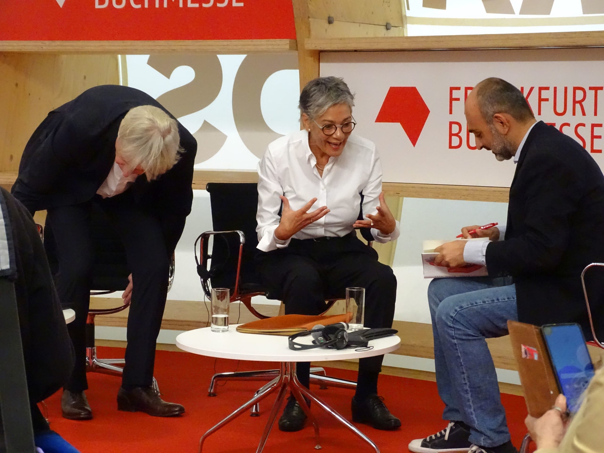 Nein, die wahre Geschichte hinter diesem Foto ist: In dreißig Jahren Buchmesse habe ich noch nie gesehen, wie Direktoren und Vorsteherinnen den Ehrengast ebenso artig wie live um eine Widmung bitten.