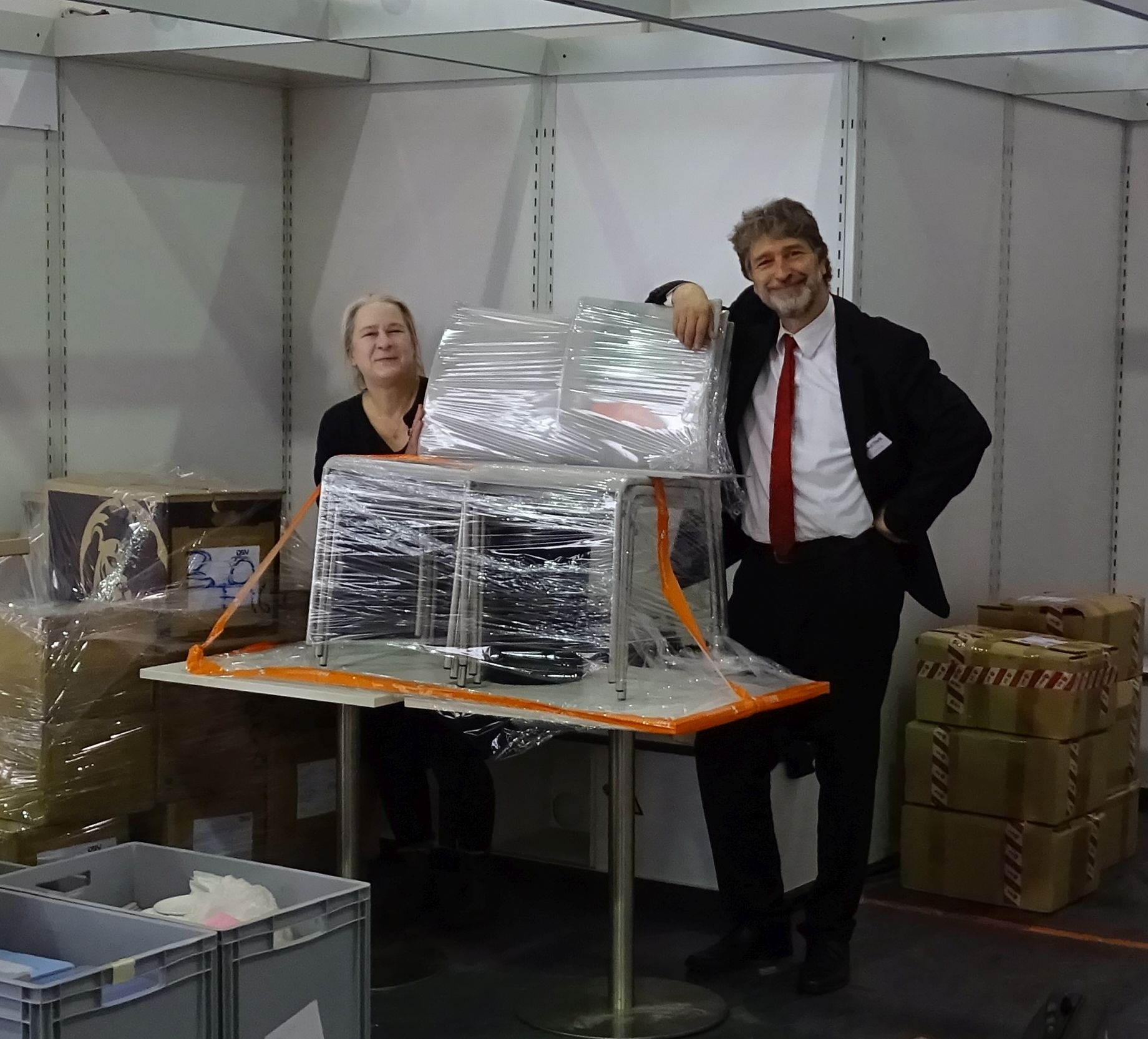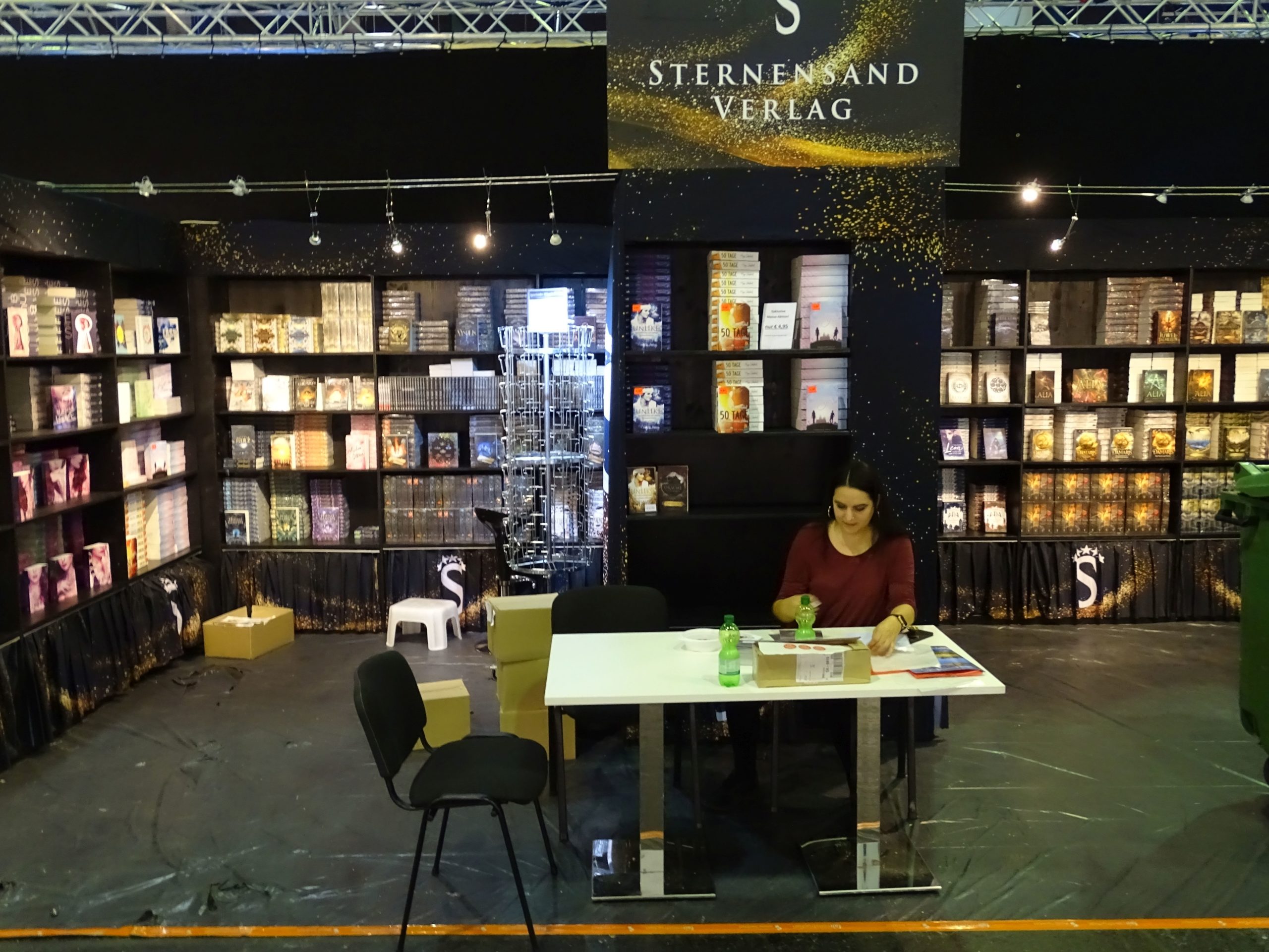 Das ist der BuchMarkt-Stand vor seiner Auspackung, links meine Redakteurin Susanna Wengeler und ich daneben. Was für ein Poser ich bin. Wie ich dastehe und strahle! Und wenn das Foto gemacht ist, gehe ich weg und lasse Frau Wengeler völlig allein mit dem ganzen Gerümpel.