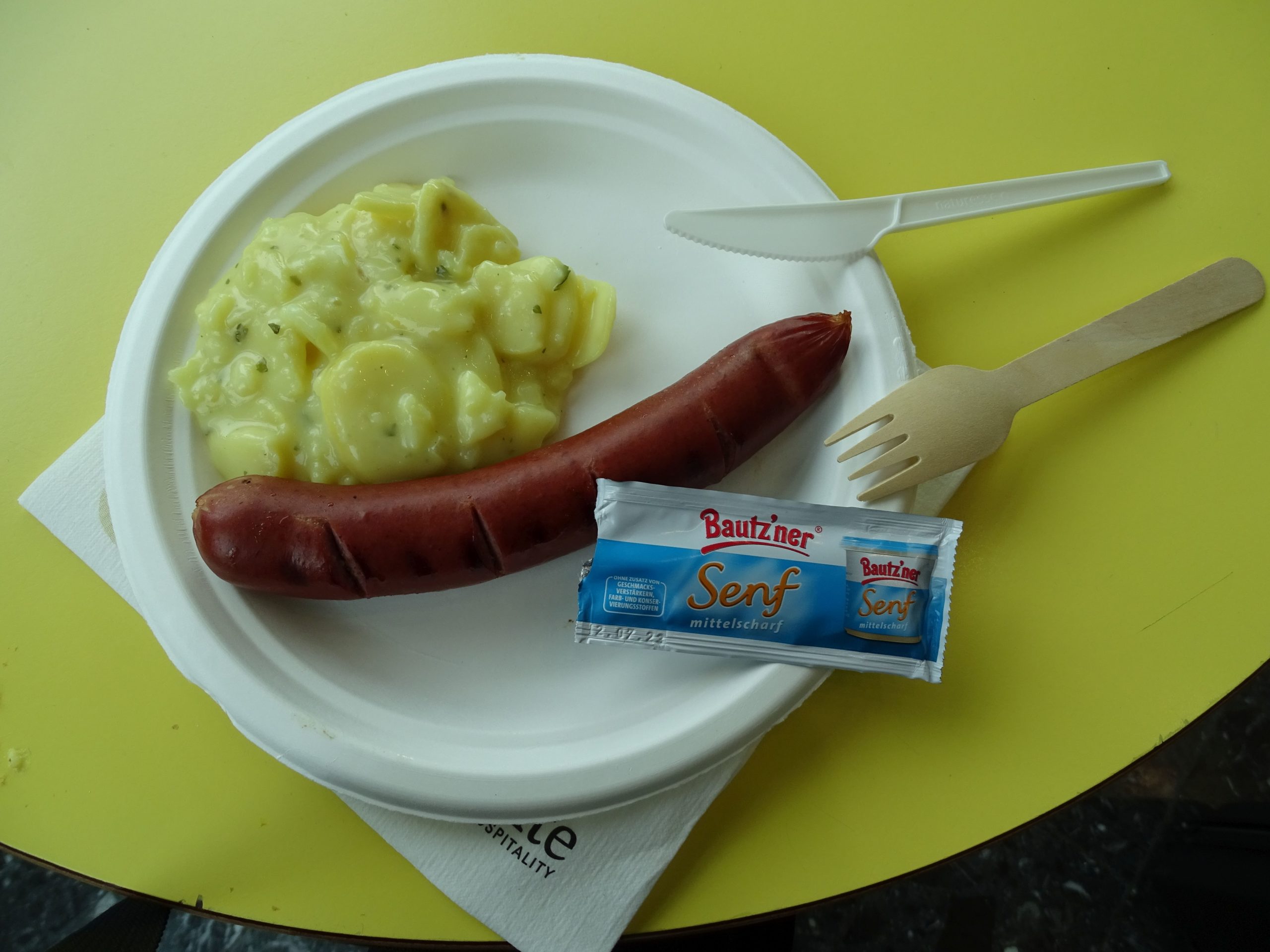 Ich gönnte mir heute eine Rindswurst mit vier Gramm Kartoffelsalat, zu ordentlichen Messepreisen so teuer wie vier Gramm Marihuana. Dagegen ist gar nichts auszusetzen, das nehme ich in Kauf.