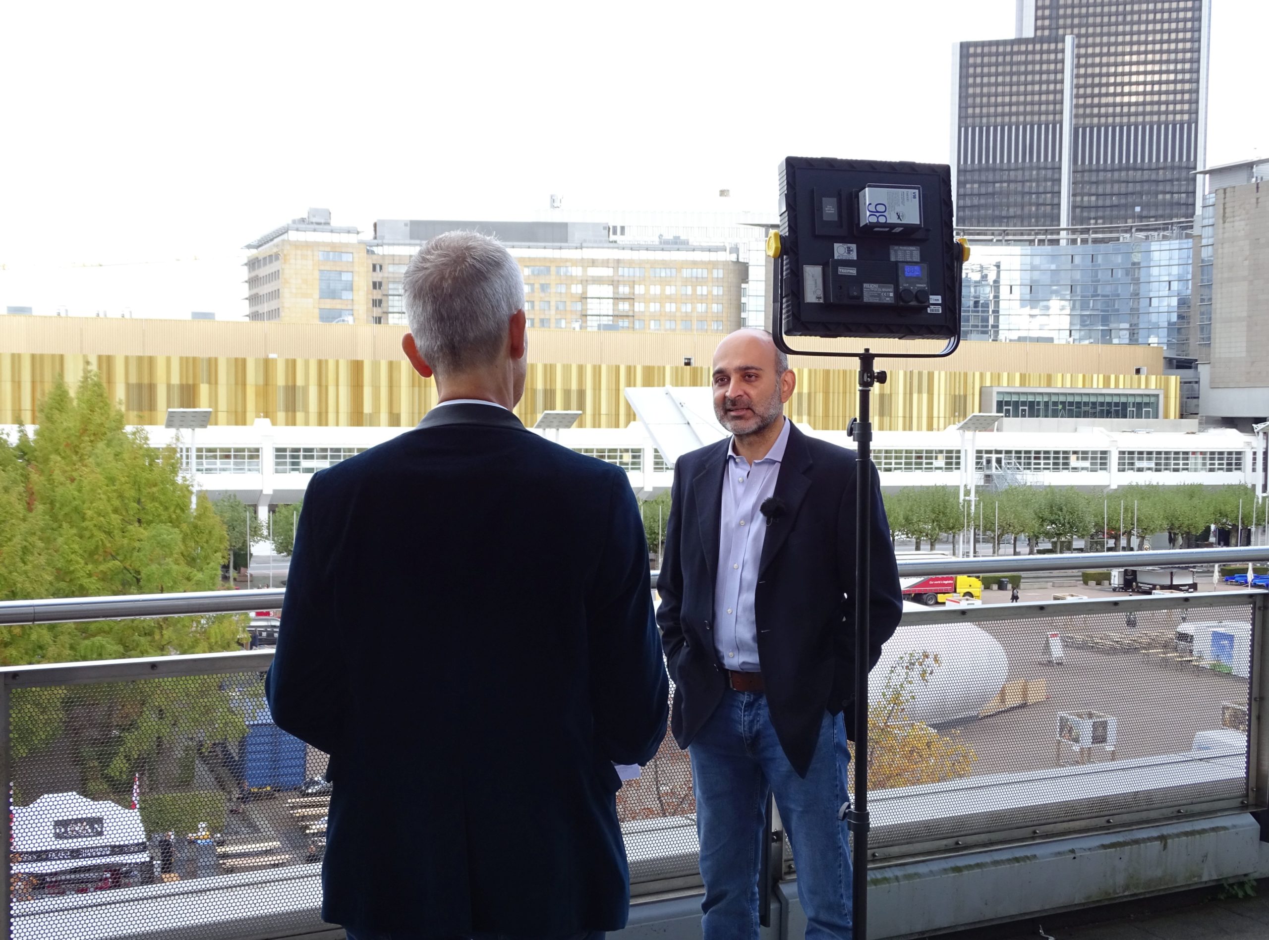 Typisch für die Messe am Pressedienstag: Stehende Interviews vor prahlerischer Kulisse.
