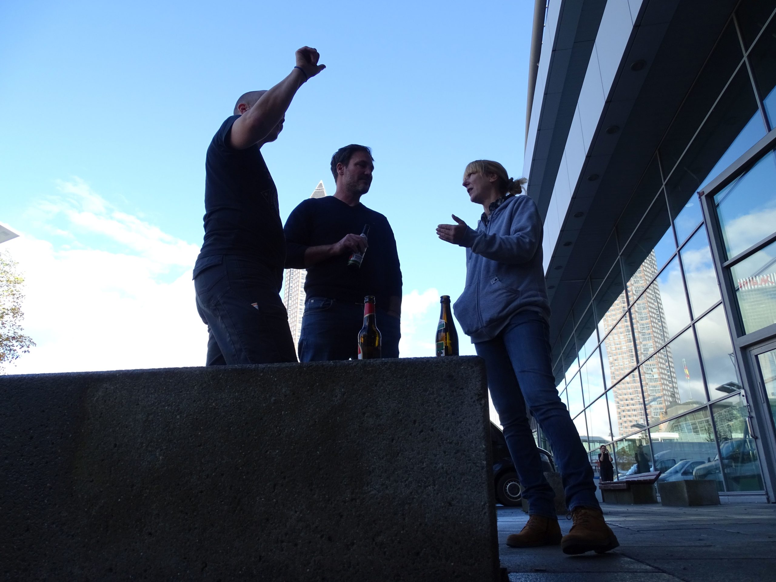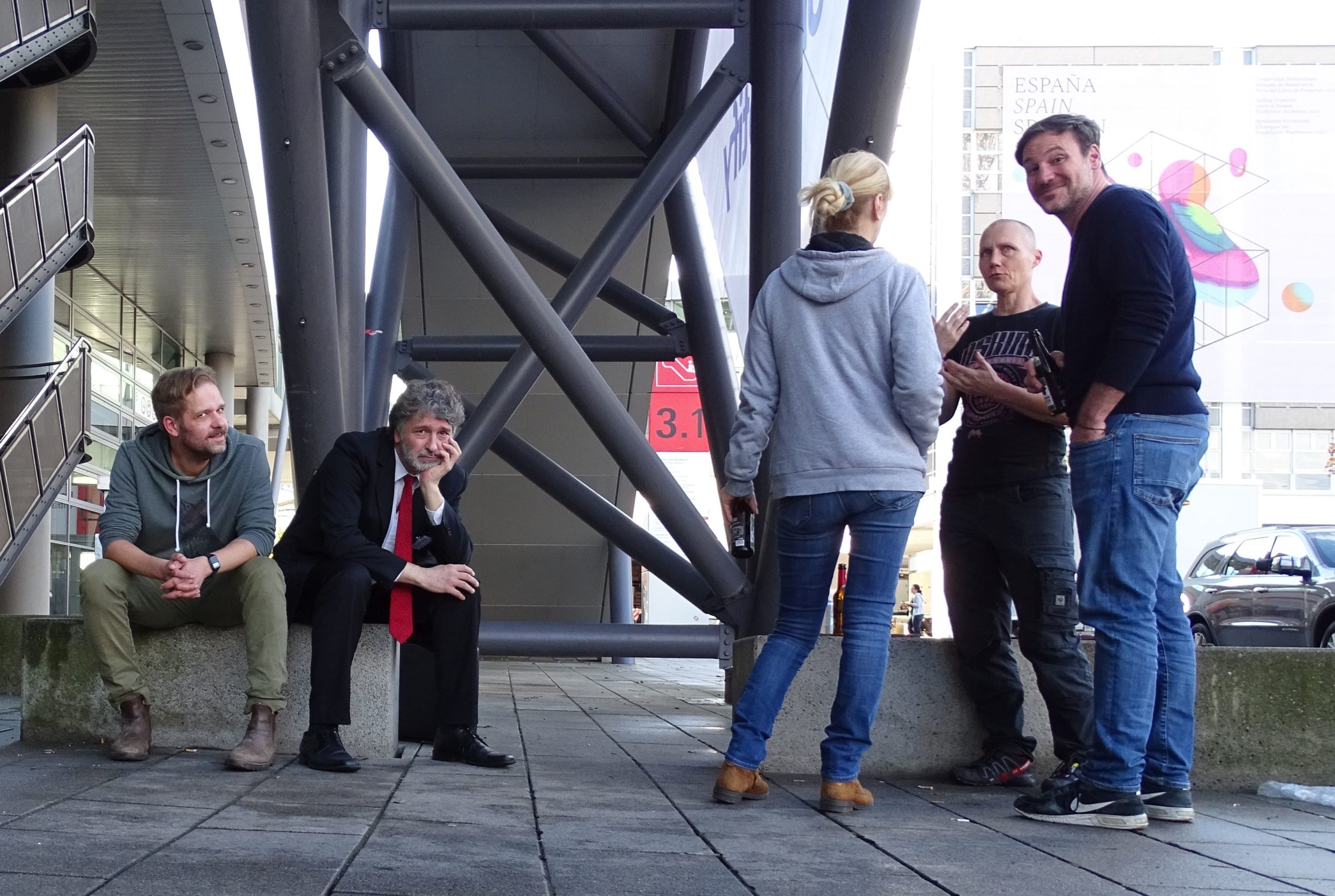 Und wen trifft man hier draußen unter der Rolltreppe zu Babel? Den eBuch-Vorstand! In Wahrheit sind die alle mit auf dem Foto, das just von Julian Müller gephotobombt wird: