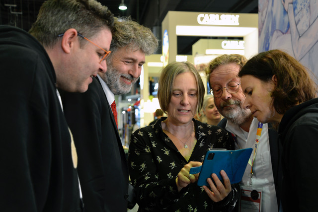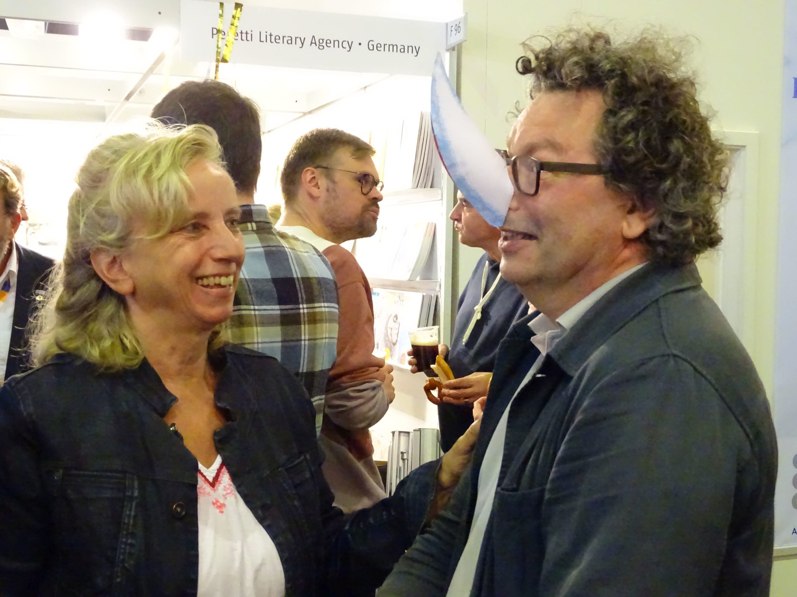 Felix Busse, Vielflieger-Verlag, der Messe-Mayer, Maren Ongsiek vom Börsenverein, ein Berber, Peggy Sasse von Zweitausendeins. (Foto Susanna Wengeler)