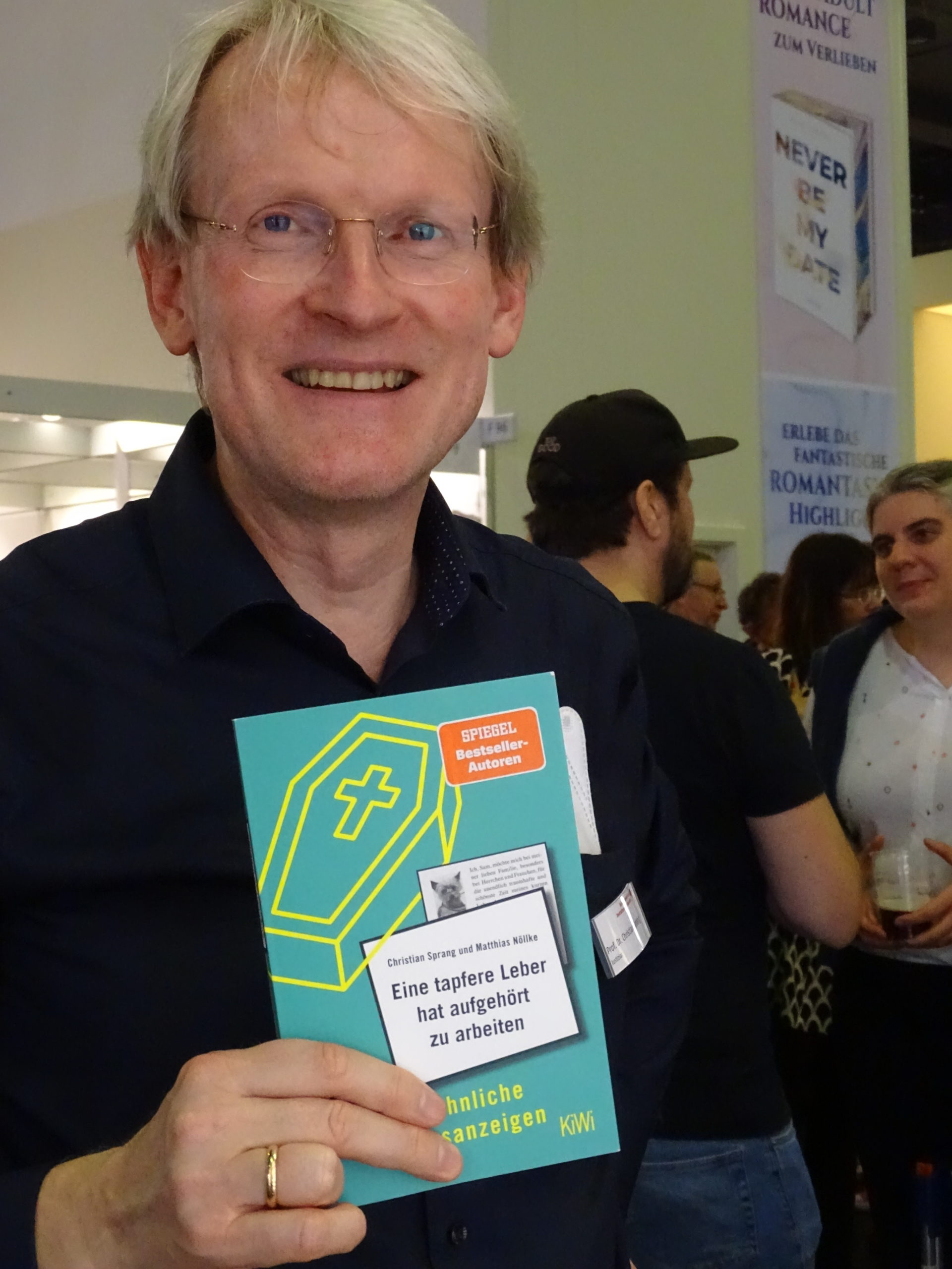 Der Justiziar des Börsenvereins des Deutschen Buchhandels, Dr. Christian Sprang, stellt sein neuestes Buch kurioser Todesanzeigen vor. Dr. Sprang will wohl unbedingt ins Schaufenster am Donnerstag.