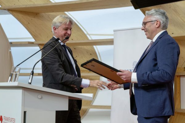 Im Anschluss an die Laudatio überreichte Tim Jung dem Direktor der Frankfurter Buchmesse, Juergen Boos, die Preisurkunde.
