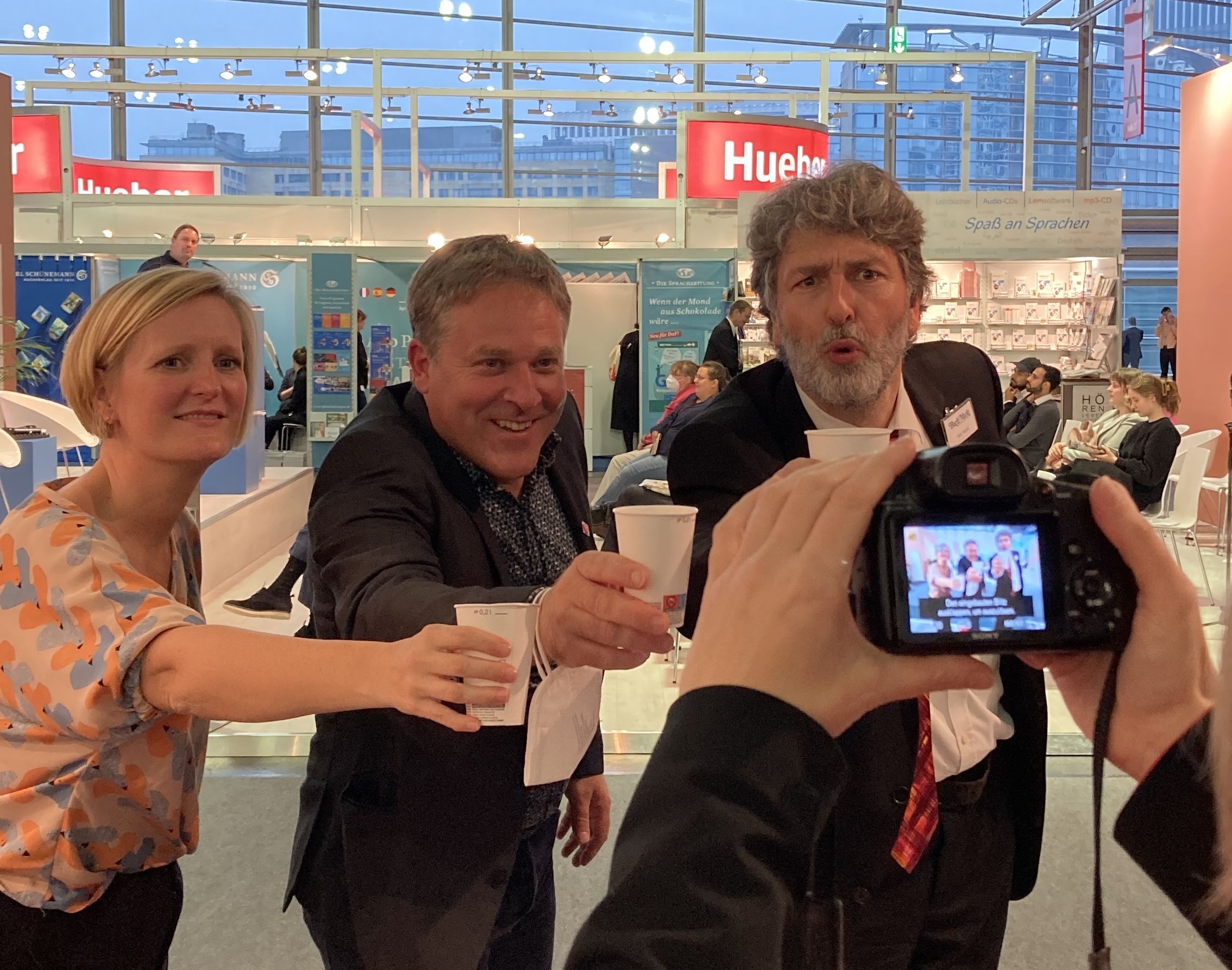 Die Hanseatische Gesellschaft für Verlagswesen hatte mich bereits von langer Hand im Vorfeld zum Kaffee eingeladen! Hier sitze ich mit Herrn Schwindt und Frau Euringer. Die HGV hat keinen eigenen Stand, aber eines dieser modernen Büros mit Messegatronomie
