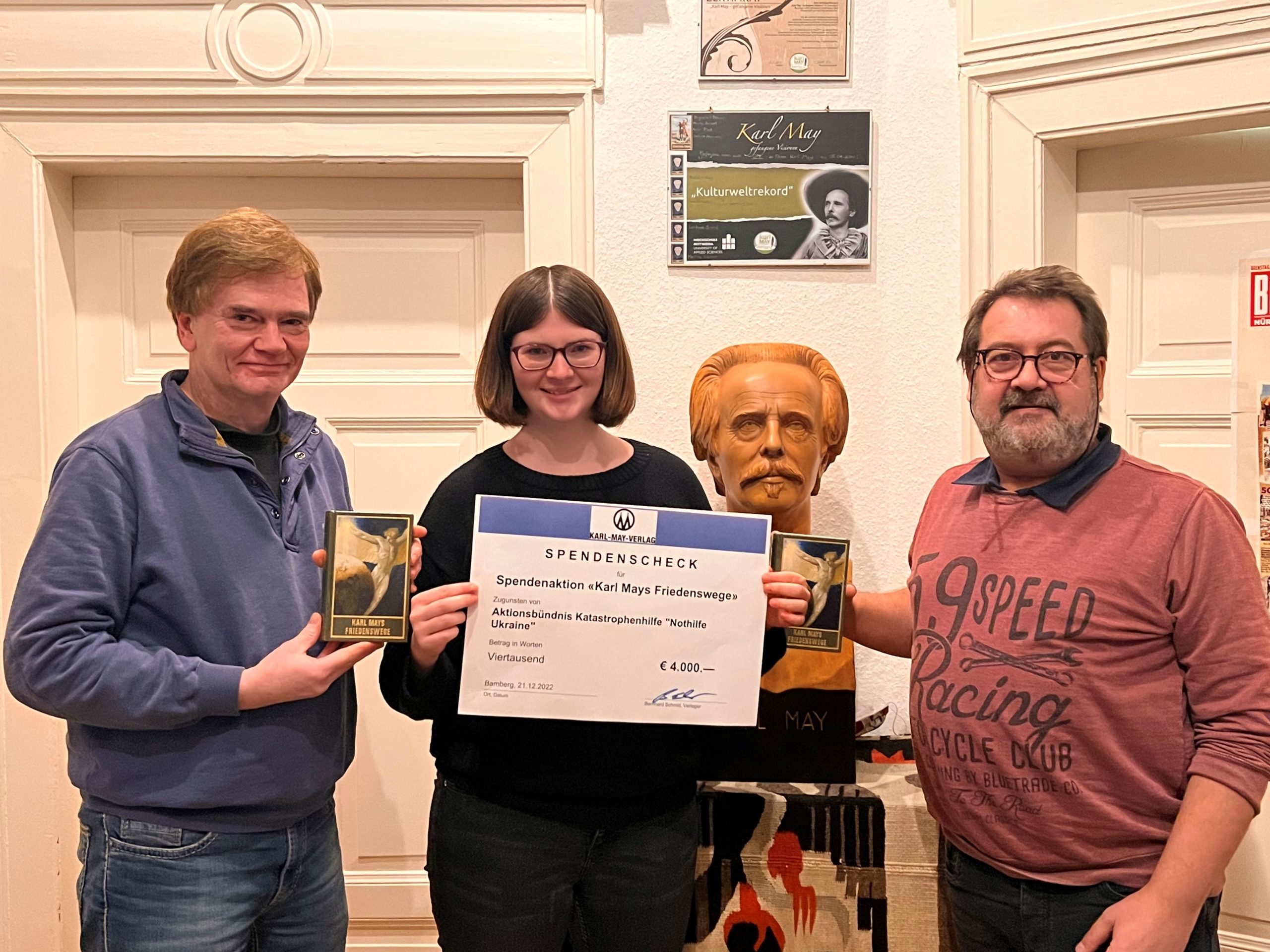 Die Spendenaktion „Karl Mays Friedenswege“ des Karl-May-Verlags „ist sehr erfolgreich“, freuen sich die Initiatoren. Der gesamte Netto-Umsatz des gleichnamigen Buchs aus dem Verkauf von 2022 in Höhe von 4.000 Euro kommt dem Aktionsbündnis Katastrophenhilfe „Nothilfe Ukraine“ zugute. „Leider hat sich der Buchhandel kaum an der Aktion beteiligt“, bedauert der Verlag. „Diese wird auch im nächsten Jahr weitergehen.“