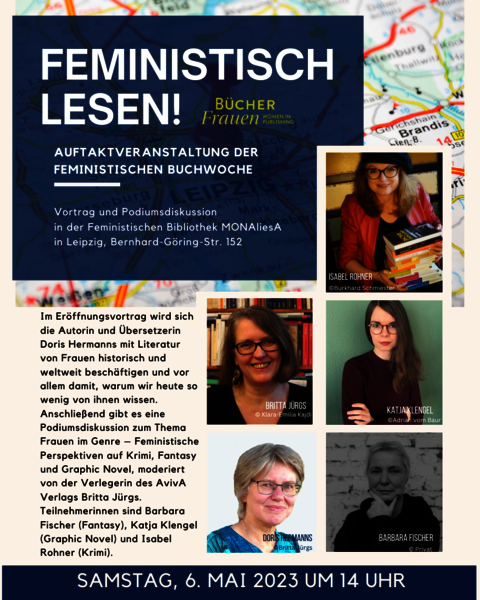 Anschließend gibt es eine Podiumsdiskussion zum Thema „Frauen im Genre – Feministische Perspektiven auf Krimi, Fantasy und Graphic Novel“, moderiert von der Verlegerin des AvivA Verlags, Britta Jürgs. Teilnehmerinnen sind Barbara Fischer (Fantasy), Katja Klengel (Graphic Novel) und Isabel Rohner (Krimi).