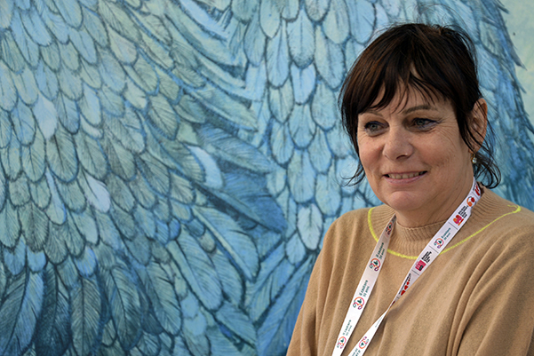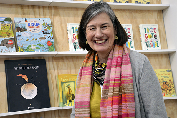 Wir begegnen Linda Wolfsgruber, die am Stand der Schule für Kinderbuchillustration in Sarmede Mappen sichtet. Von ihr werden wir im Herbst u.a. das Bilderbuch Sieben. Die Schöpfung bei Tyrolia sehen, für das sie jeweils sieben Bilder für jeden Tag der Schöpfungsgeschichte gezeichnet hat. Außerdem erscheint bei Jungbrunnen Warum der Mond keine Kleider hat, eine Geschichte, die Linda Wolfsgruber häufig bei ihrer langjährigen Arbeit in Workshops mit Kindergartenkindern in Südtirol erprobt hat.