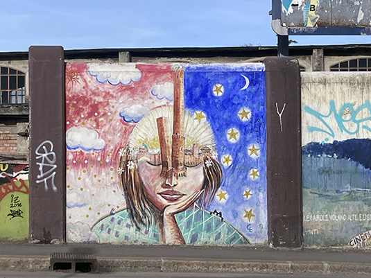 Außer am Messe-Mittwoch, meinem Abreise-Tag, an dem die Busse streiken. Da visualisiere ich eine leichtfüßige Petra Albers, denn von der Verlagsleiterin des Beltz Kinder- und Jugendbuchs wird erzählt, dass sie immer schon zu Fuß aus der Stadt zu den Ausstellungshallen gelaufen ist. Ich stelle sie mir natürlich ohne meinen Koffer und meine Kamera-Tasche vor, und siehe da, auch ich schaffe den Weg und bestaune nebenbei noch Malereien auf der Brücke über die Bahnhofsgleise. Das soll uns die KI erstmal nachmachen.
