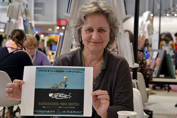 Anke Kuhl hat bereits eine Reihe von Workshops für Schulklassen in Bologna absolviert, bevor sie die Buchmesse erkundigt, und Klett Kinderbuch-Verlegerin Monika Osberghaus kann schon das Cover eines neuen Buchs der Illustratorin zeigen – wieder nach einem Text von Katharina van der Gathen, und wieder mit einem ganz anderen Thema: Radieschen von unten ist Das bunte Buch über den Tod für neugierige Kinder.