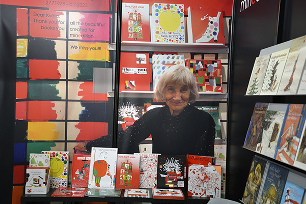 Am Stand von minedition schließlich bleiben wir länger stehen, um auf die beeindruckende Vielfalt des Werks der unlängst verstorbenen Kveta Pacovská zu blicken, eine Backlist, die beständig gepflegt wird. Über viele Jahre war man es gewöhnt, ihr in Bologna beim kunstvollen und geduldigen Signieren ihrer Bücher zusehen zu können. Zur Bologna-Messe gehörte sie einfach dazu. Eine Wand des minedition-Standes wurde in diesem Jahr von einem großen Foto der Künstlerin geschmückt, so dass sie doch ein wenig mit dabei war.