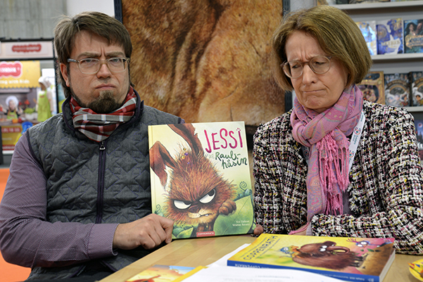 Bei Coppenrath kommt ein neues Buch des Dream-Teams Kai Lüftner und Wiebke Rauers: Jessi, die Raubhäsin, ist eine rebellische Figur, die zunächst lieber auf sich allein gestellt verschiedenen Tieren im Wald in brenzligen Situationen hilft, sich schließlich aber doch mit dem Wehr-Schwein anfreundet. Nicola Dröge, Programmleiterin Kinder- und Jugendbuch, und Geschäftsführer Lambert Scheer sind von dem Titel so überzeugt, dass sie ihm ein Plüschtier in der Spiegelburg zur Seite stellen und einzig aus Solidarität mit ihrer neuen Bilderbuch-Heldin für einen kurzen Moment grimmig in die Kamera gucken.