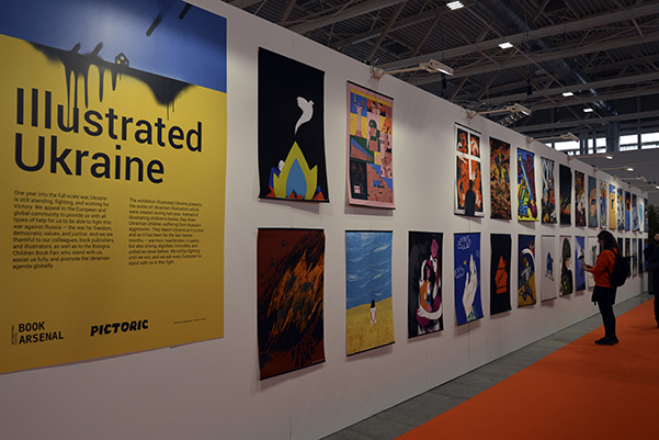 Die Ukraine war in diesem Jahr u.a. mit einem Stand des Ukrainischen Buchinstituts sowie mit einer Ausstellung der Plakate des Pictoric Illustrators Club sichtbar. Dort treffe ich zufällig Gerstenberg-Verlegerin Daniela Filthaut, die mir Romana Romanyschyn und Anrij Lessiw vorstellt, die bereits drei Titel bei den Hildesheimern veröffentlicht haben und mit einem davon, Sehen, im vergangenen Jahr für den Deutschen Jugendliteraturpreis nominiert waren. Ein viertes Buch folgt im Herbst: In Hierhin, dahin. Immer in Bewegung geht es um Mobilität in jeder Form, um Reisen, Migration, Karten, Navigation und darum, den eigenen Weg zu finden. Die beiden Künstler, die in Llwiw das Studio Agrafka betreiben, sind mit einem besonderen Motiv auch in der Pictoric-Ausstellung vertreten.