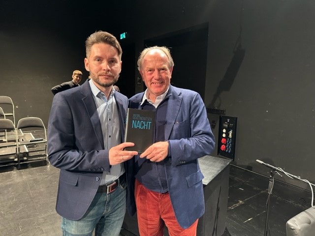 Am 23.3.2023 stellte der in Minsk (Belarus) lebende Autor Viktor Martinowitsch (links im Bild) im Münchner Volkstheater seinen soeben erschienenen dystopischen Gesellschafts- und Liebesroman Nacht – eine Parabel, wie er selber sagte – vor. Europa-Verleger Christian Strasser (rechts im Bild) moderierte das Gespräch, zu dem fast 100 Gäste gekommen waren. Viele in München lebende Exil-Weissrussinnen und -Weissrussen belebten das mehrsprachige Gespräch über Heimat, Sprache und Leben in bedrohlichen Zeiten auf eindringliche Weise.