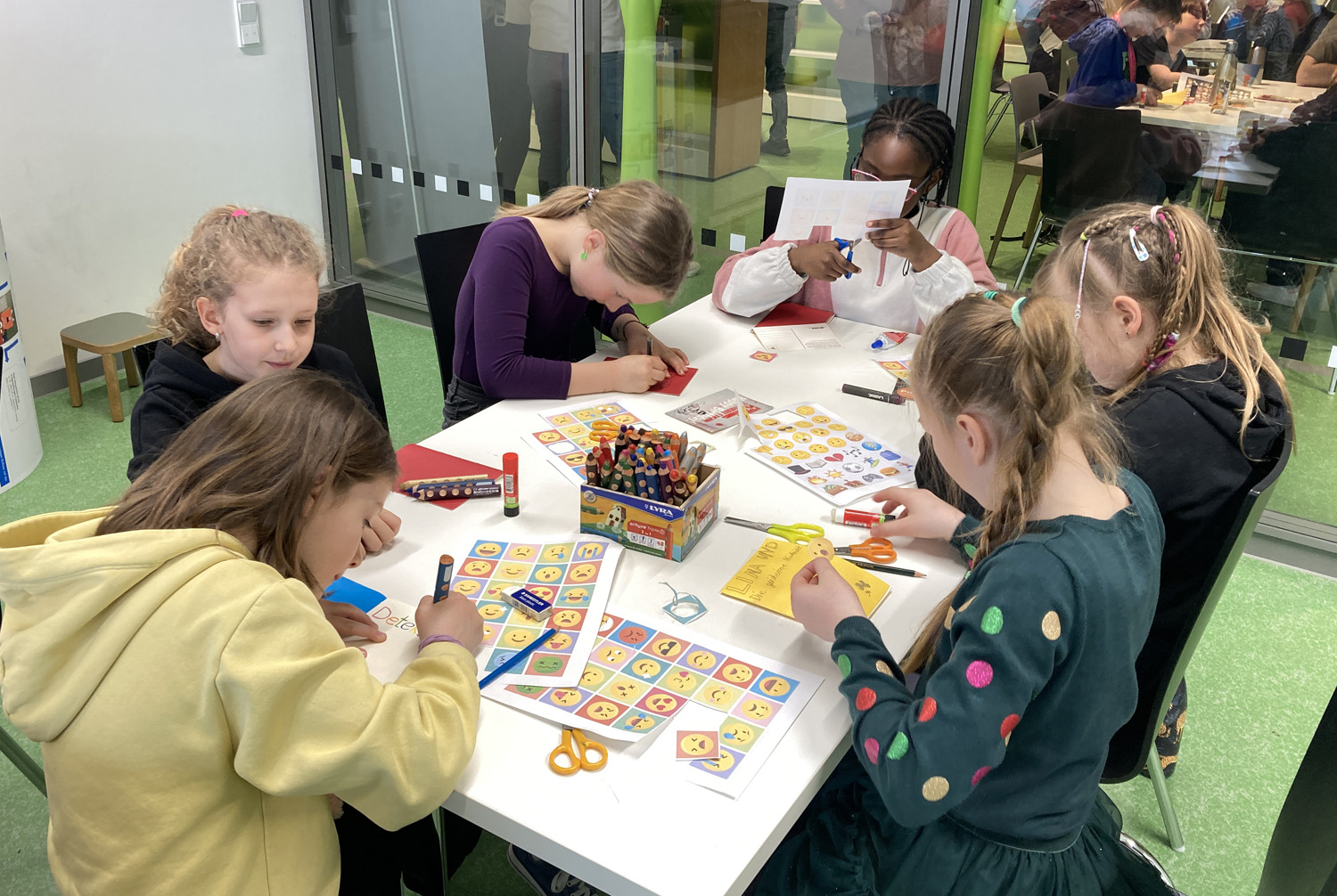 In der anschließenden Schreibwerkstatt erhielten die Schüler*innen Anregungen von Kinder- und Jugendbuchautorin Aygen-Sibel Çelik und haben sich in kurzer Zeit, eigene Geschichten ausgedacht. Mit Stift und Bastelmaterial wurden sie kreativ zu Papier gebracht. Die entstandenen Büchlein unter anderem mit Liebesgeschichten von Emojis werden in einer Ausstellung in der Zentralbibliothek präsentiert.