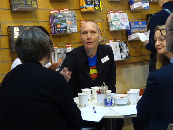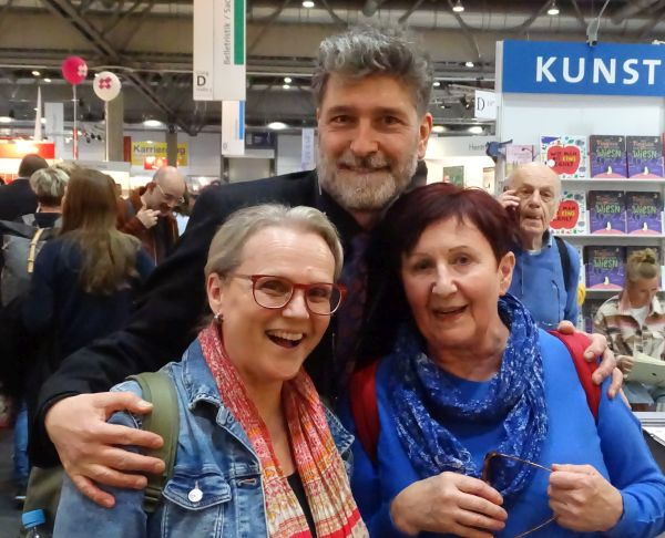 Am Stand von Kiepenheuer & Witsch wollte ich eigentlich nur mein tägliches Mustonenfoto einholen, aber Mirjam Mustonen saß schon wieder mit so vielen fröhlichen Leuten am Tisch, dass ich kaum durchdrang.