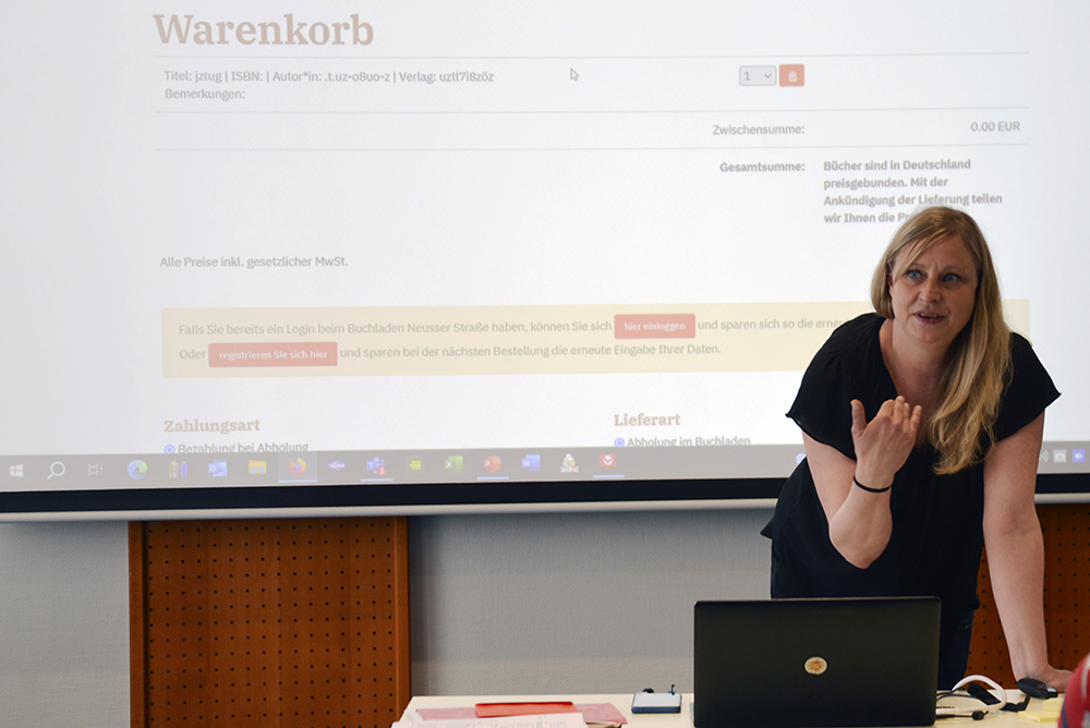 Maike Michelis stellte u.a. Stärken und Schwächen von White Label Shops vor sowie die Vorzüge einer Landing Page, auf der man ausführlicher Kund:innenservice und Mehrwerte einer Buchhandlung kommunizieren könne. Dabei seien SEO-taugliche Texte sinnvoll, die man mit ChatGPT überprüfen kann.