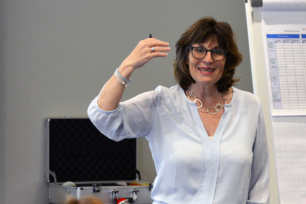 Stephanie Lange, Vertriebsberaterin und Coach, gestaltete das Programm für den Freitagnachmittag sowie den Samstag. Auch sie stellte ein verändertes Kund:innenverhalten dar. Buchhändler:innen würden im Wettbewerb vor allem um Zeitbudgets ihrer Kundschaft ringen. Produktorientierung sei schon lange weg – „Wir alle habend genügend Bücher zu Hause.“ Vielmehr gehe es um das Erlebnis, in einer Buchhandlung zu sein. Dabei sei die Gefahr, Kund:innen zu verlieren, deutlich gestiegen, weil sie mehr Einkaufsmöglichkeiten haben und mobiler sind. Besonders in kleinen Ortschaften werde leidenschaftlich online geshoppt.
