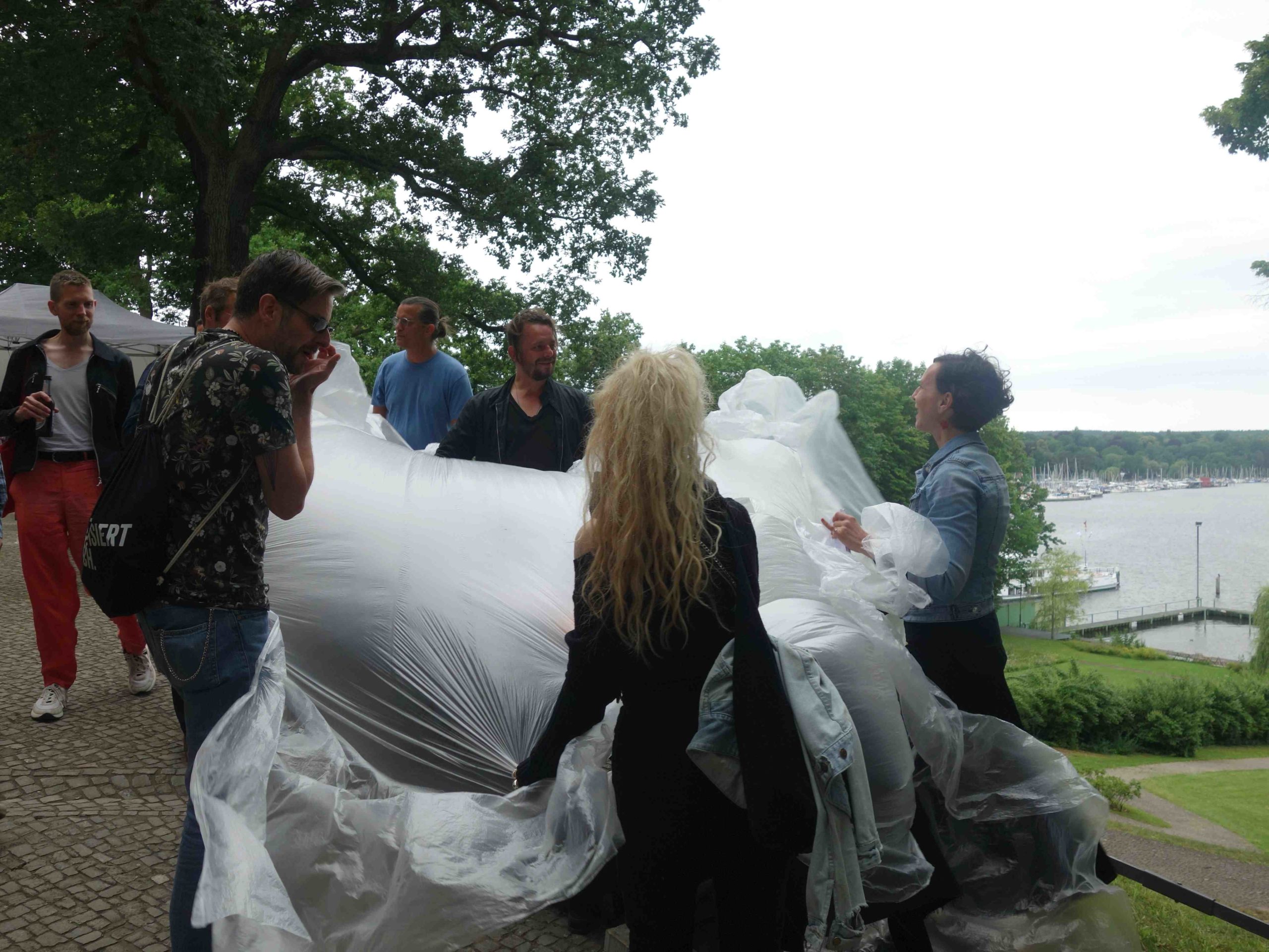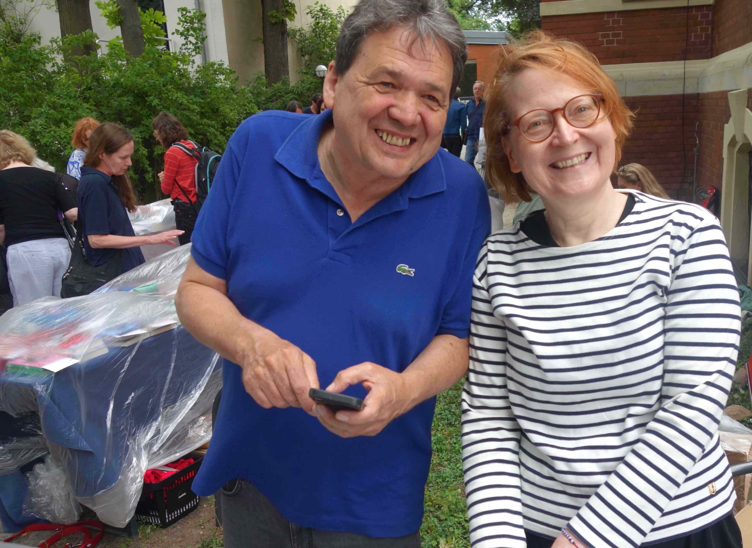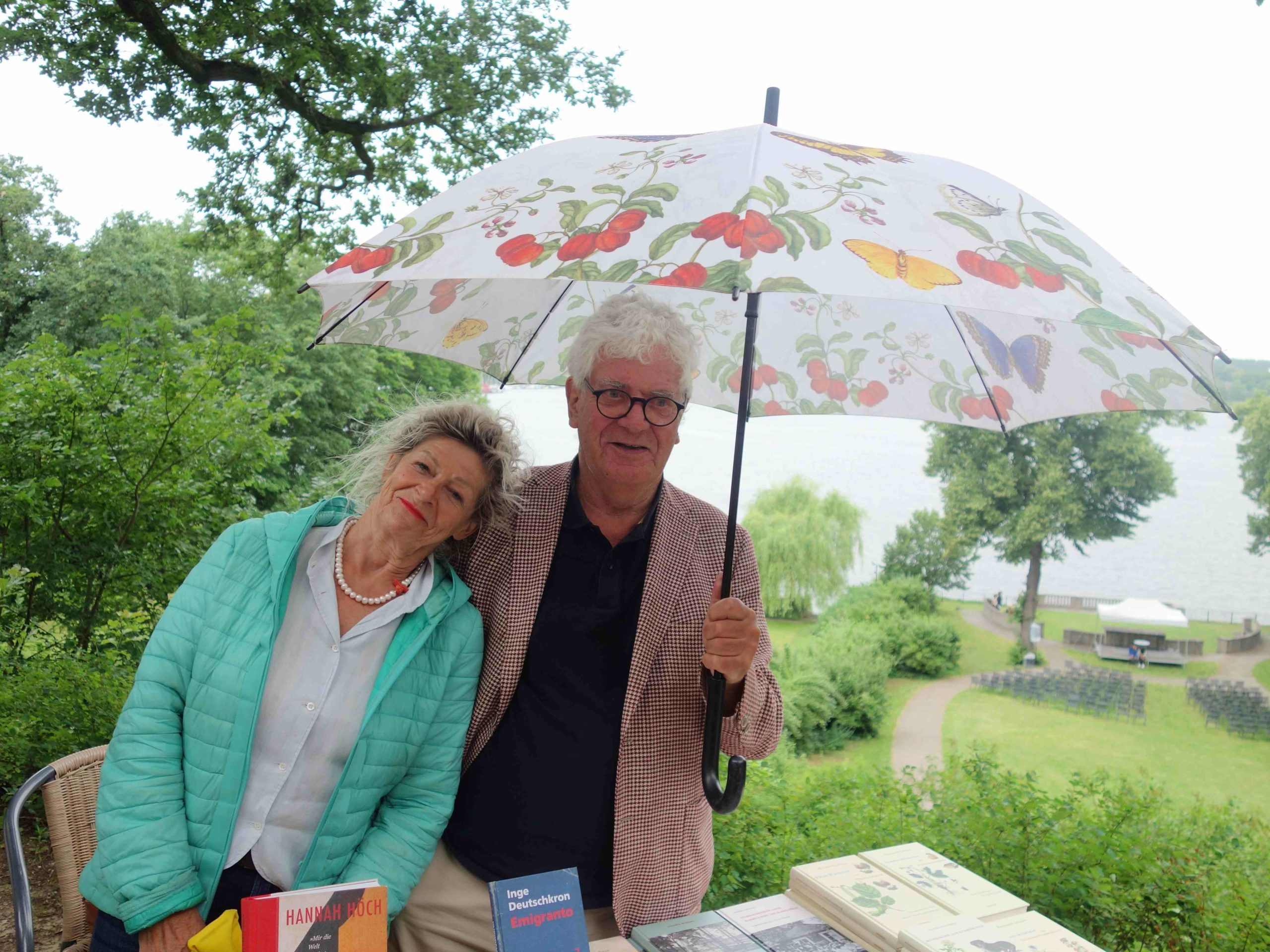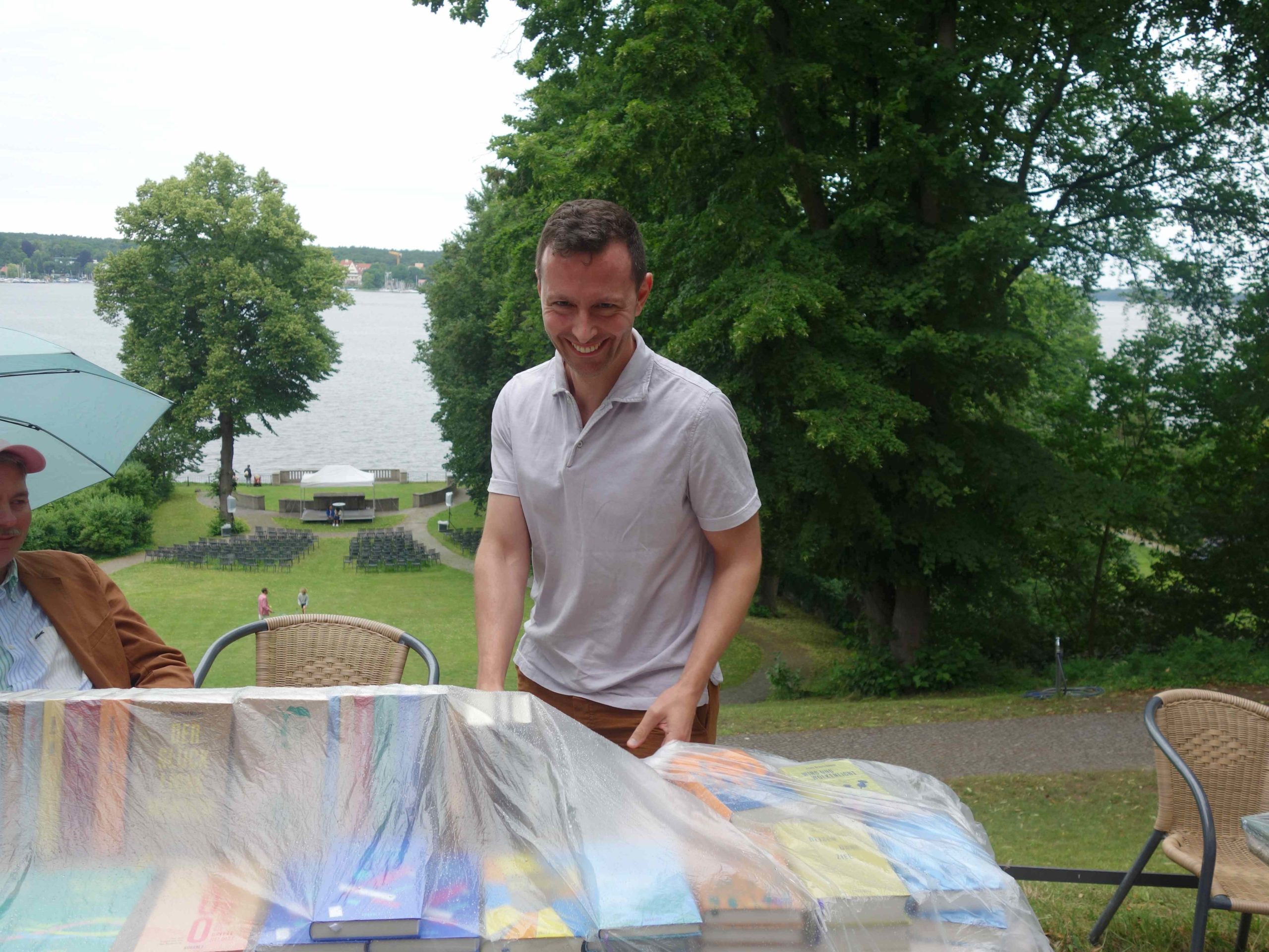 Der guten Laune der Ausstellenden konnte auch der Regen, der am späten Nachmittag einsetzte, nicht viel anhaben. Es lagen Plastikplanen bereit und das Veranstaltungsprogramm, bei dem viertelstündlich Autorinnen und Autoren wie Bernadette Conrad, Tillman Severin, Roswitha Quadflieg und Olivia Kuderewski aus ihren neuen Büchern lasen, wurde von der Seebühne in den Saal verlagert.