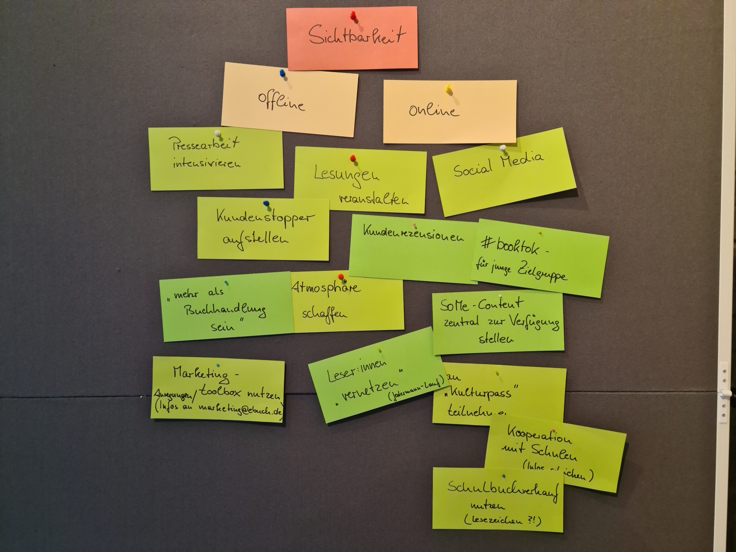 Der Teilnehmerkreis tauschte sich intensiv über branchenrelevante Themen, wie zum Beispiel „Sichtbarkeit meiner Buchhandlung“, „Marktentwicklungen“, „Nachfolge“, „Vernetzung“ und „Voneinander lernen“ aus.