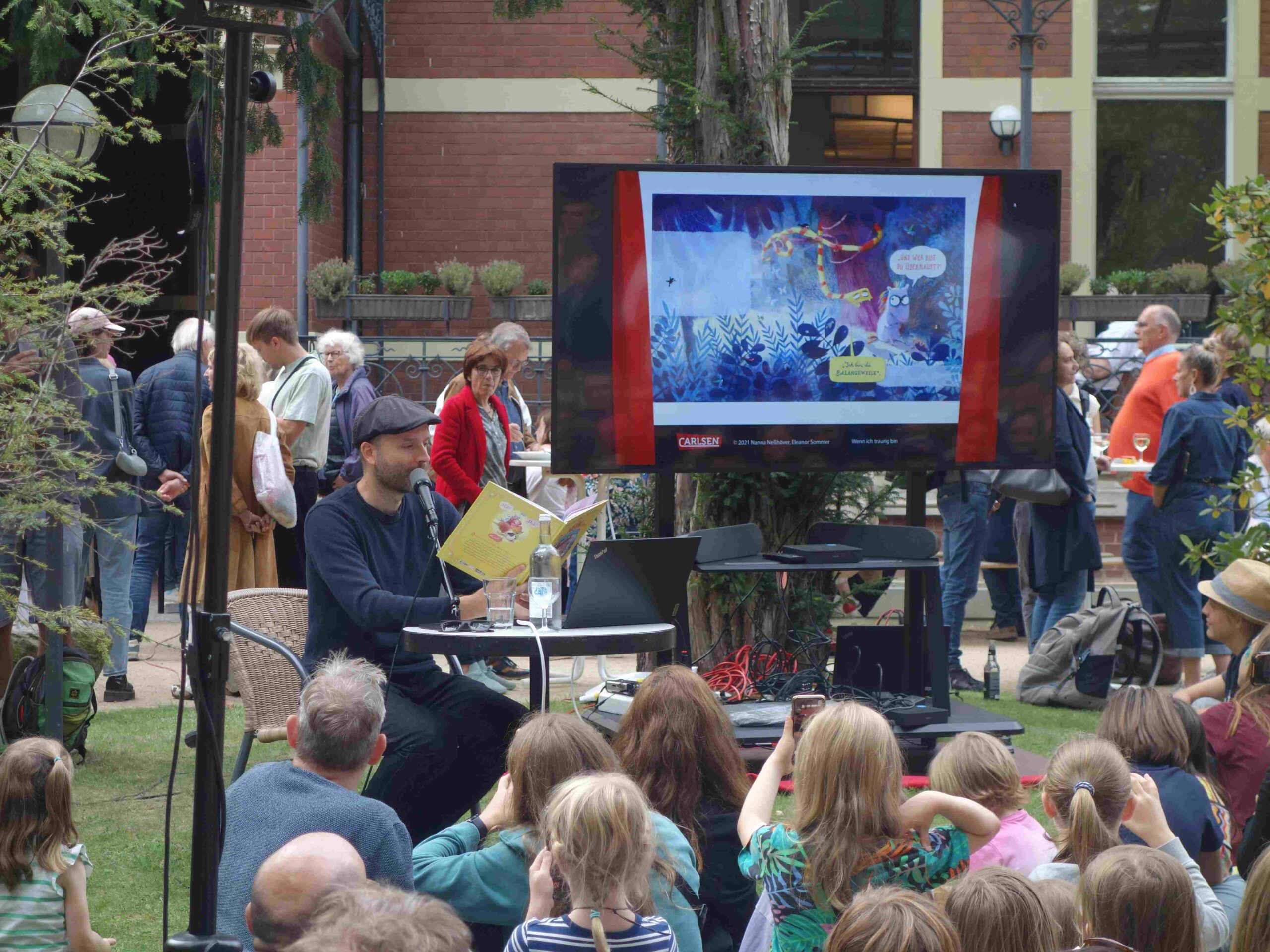 Auch an die Kinder war gedacht. Sie konnten malen und spielen und sich von Geschichten begeistern lassen. Wie ein Magnet wirkte der Auftritt von Marc-Uwe Kling, der Das NEINhorn und die SchLANGEWEILE mitgebracht hatte. Alle Kinder hatten wohl gut zugehört, als Karsten Kredel ihnen zurief: „Bleibt neugierig auf Geschichten und lasst euch von ihnen mitreißen.“