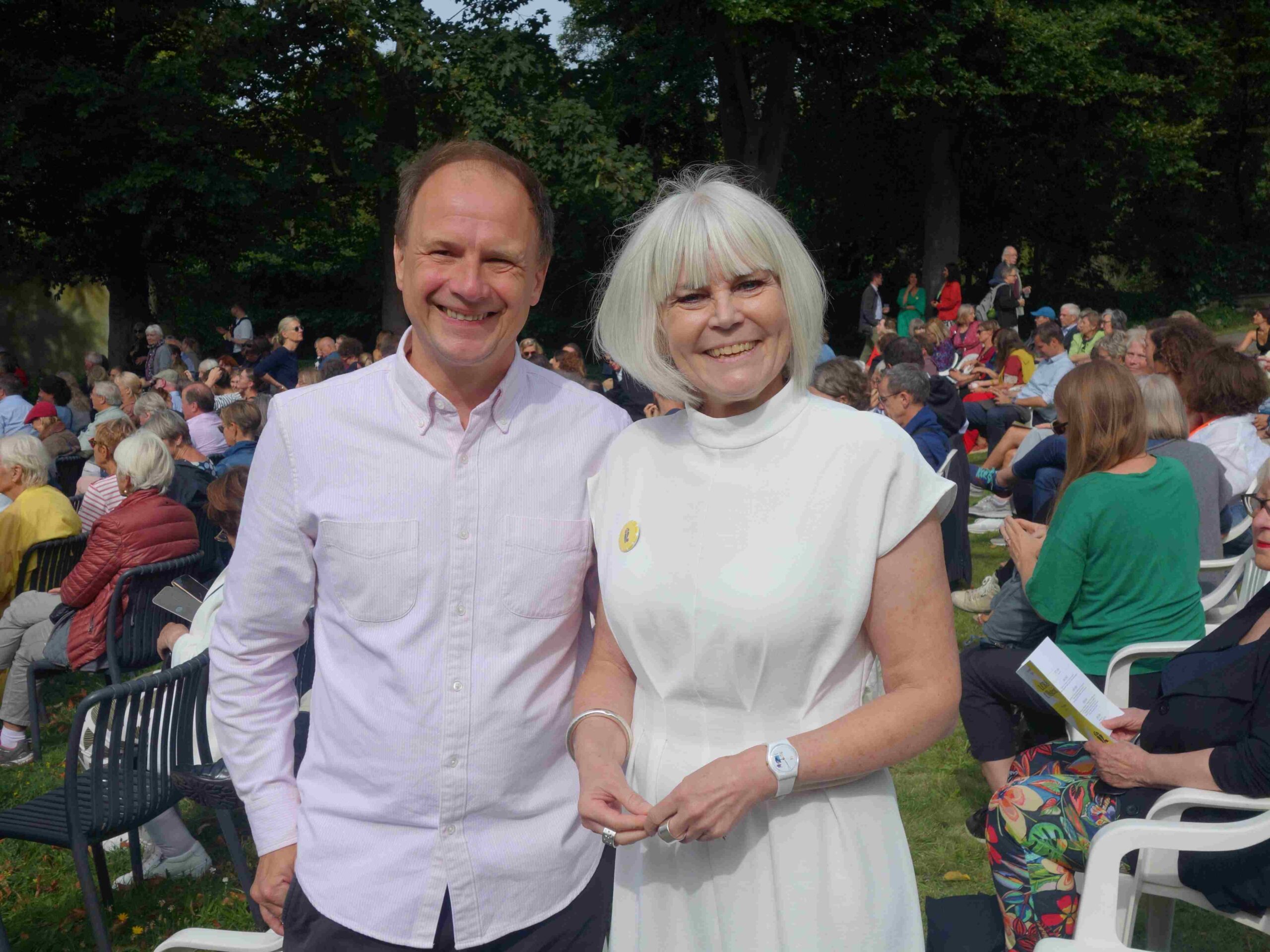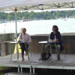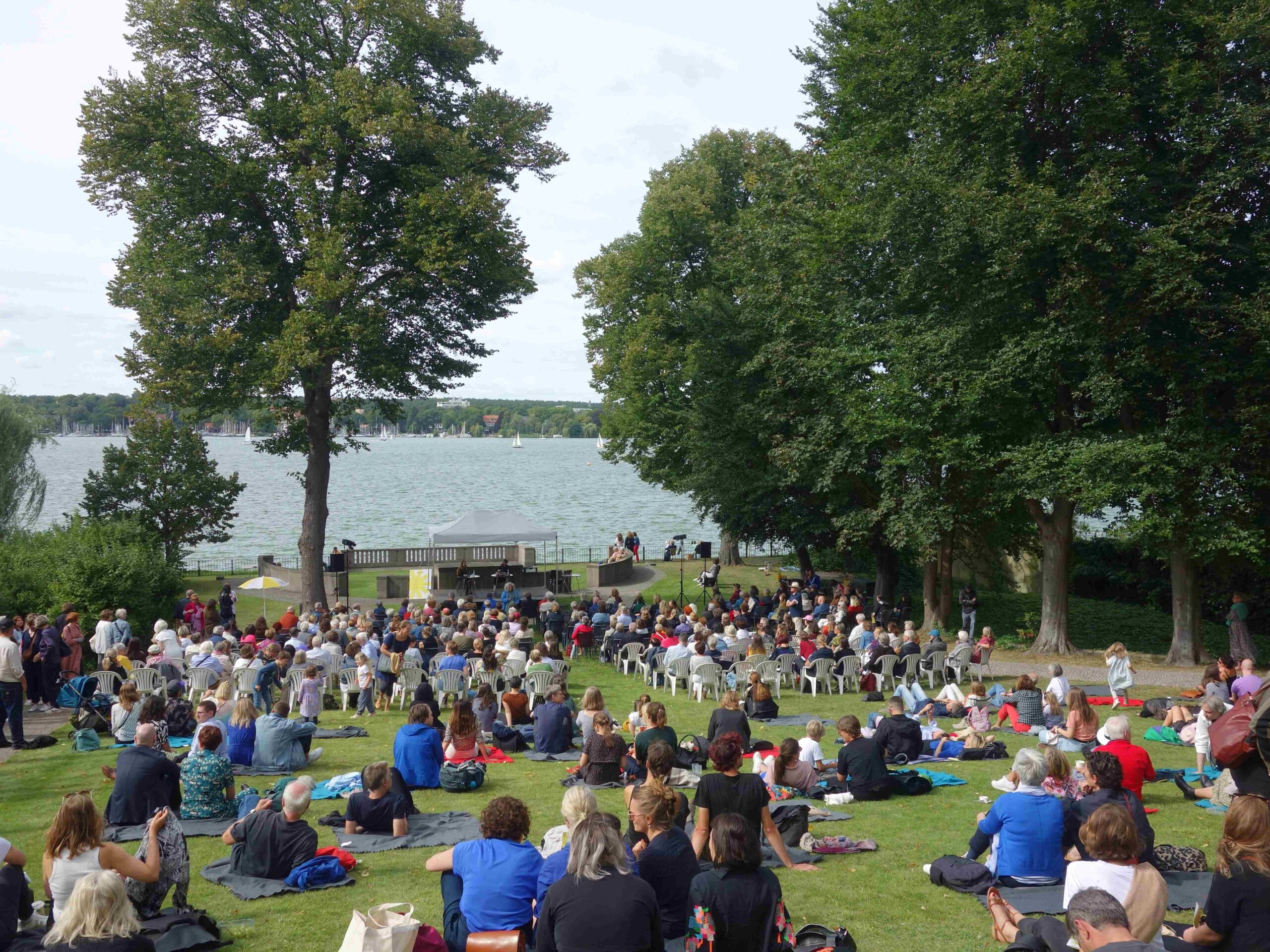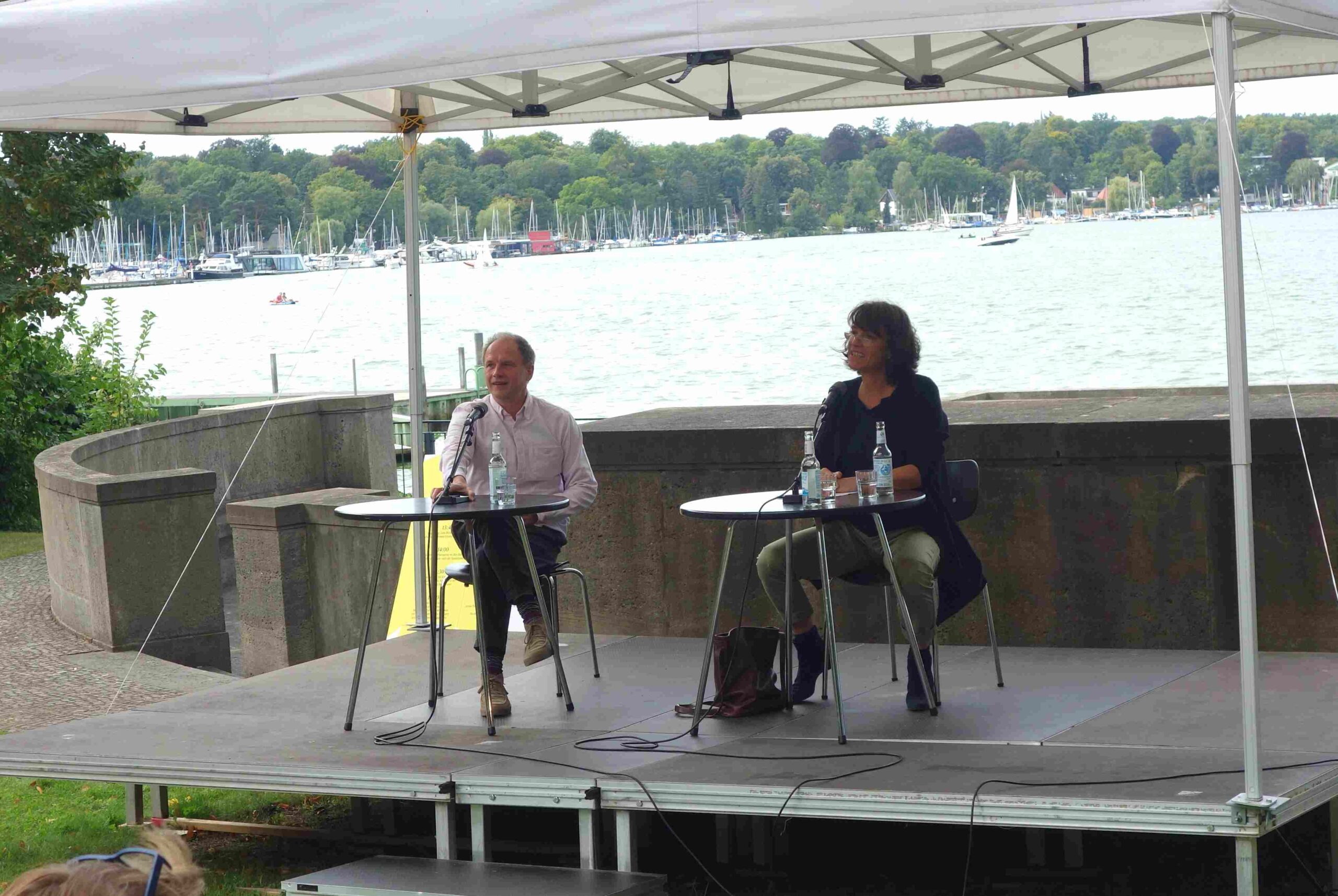 Auf der Bühne am See begrüßten Jutta Müller-Tamm vom LCB und Ullstein-Verleger Karsten Kredel die Gäste. Jutta Müller-Tamm erinnerte daran, dass es in diesem Jahr viel zu feiern gibt. Das LCB wird 60 Jahre alt und Florian Höllerer leitet diesen „Ort, der Literatur zum Erlebnis werden lässt“, seit genau zehn Jahren. Das Sommerfest gebe es in seiner jetzigen Form seit 1996, sagte sie. Und jedes Jahr werde das Programm von einem anderen Verlag gestaltet. Diesmal sind es die in Berlin ansässigen Ullstein Buchverlage, die ebenfalls allen Grund zum Feiern haben.