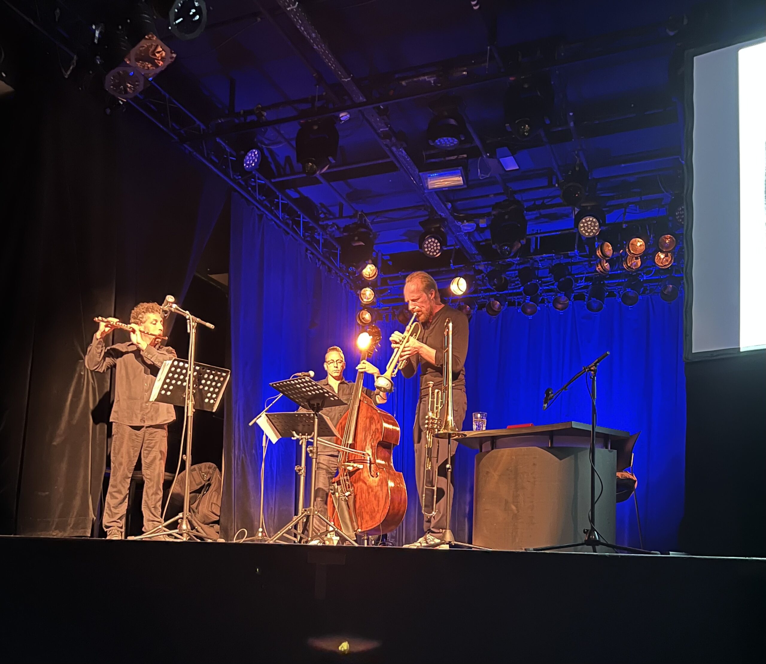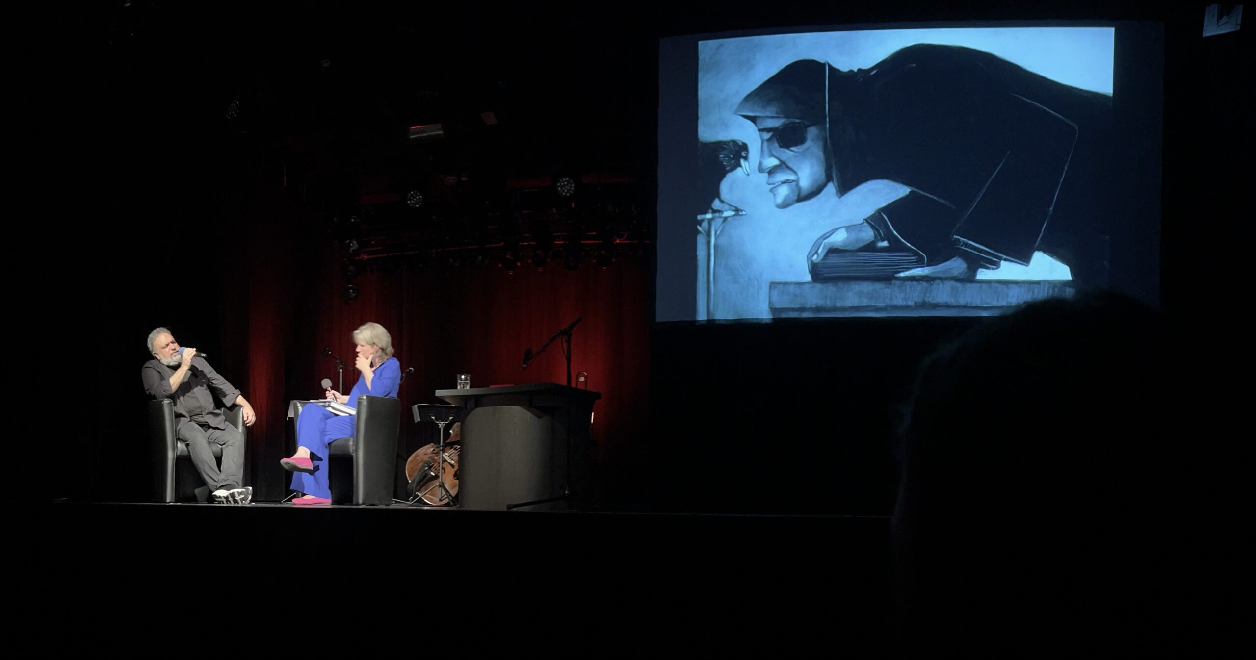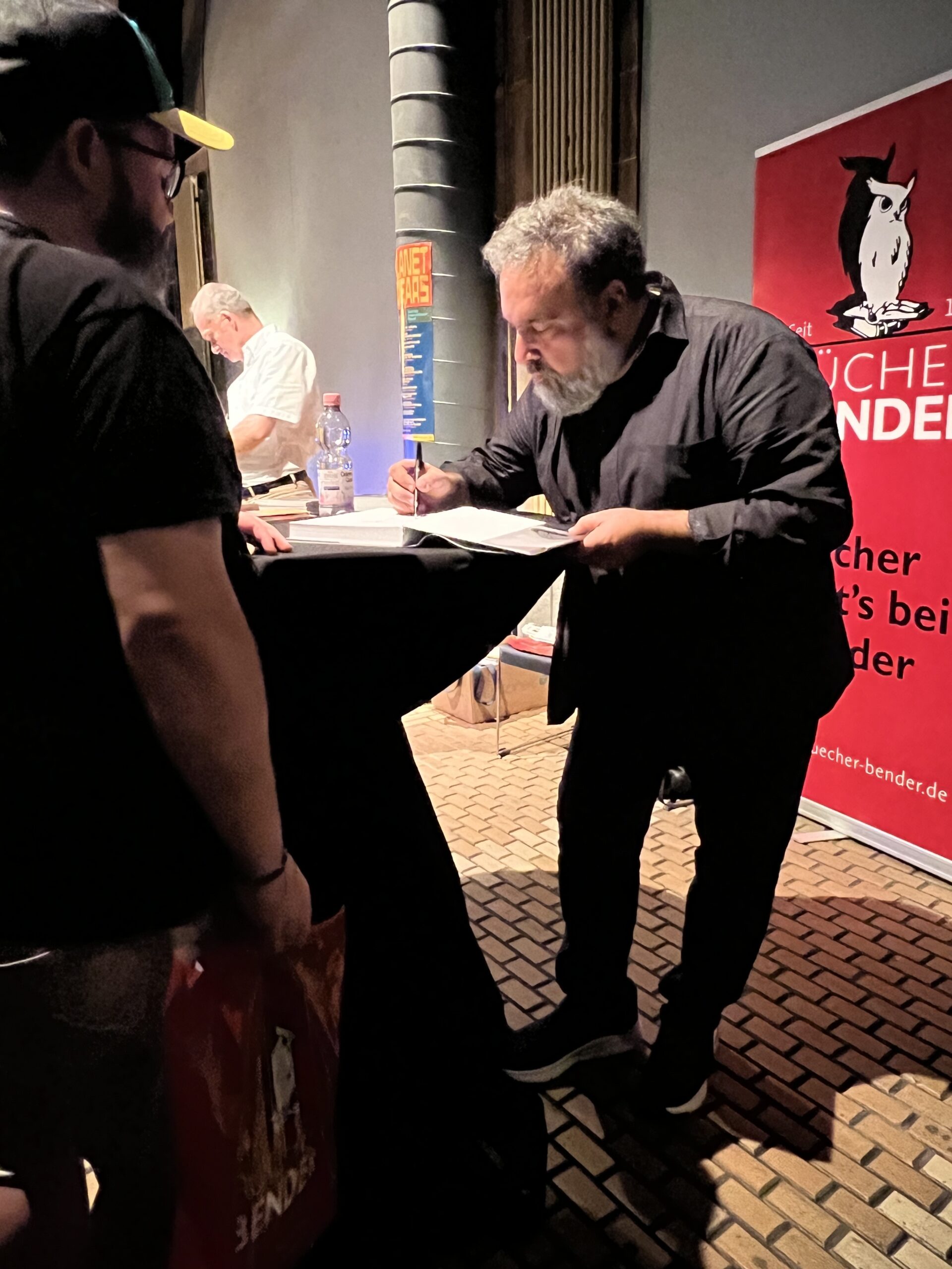 Die Veranstaltung wurde abgerundet durch Gespräche mit der Literaturwissenschaftlerin Eva-Maria Nagel und Verlegerin Bärbel Dorweiler, durch einige von der Sprecherin Birgitta Assheuer vorgetragene Krabat-Kapitel sowie Musik von Matthias Debus, Johannes Stange und Pirmin Grehl. Matthias Debus hat Musik zu Krabat komponiert, die im kommenden Jahr ihre Uraufführung haben wird, am Sonntagabend in Mannheim konnte das Publikum mit einem Arrangement für Drei vorab in diese Klangwelten eintauchen. Anschließend signierte der Illustrator anderthalb Stunden lang am Büchertisch von Bücher Bender.