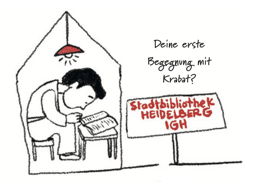 Im Gespräch mit dem Künstler wurde klar, dass er „zwei Kämpfe“ mit Krabat ausgefochten hat: Aufgewachsen in Iran, kam er mit 14 Jahren mit seiner Familie nach Deutschland. War er zuvor ein „Lesekind“ gewesen, brach dies zunächst ab, weil er erst eine neue Sprache lernen musste. Krabat jedoch sei eines der wenigen Bücher gewesen, das er gerne las, obwohl er viele Wörter nachschlagen musste. „Mir gefiel, dass dieses Buch es einem nicht übertrieben süß und schön machen wollte, obwohl es ein Kinderbuch war.“